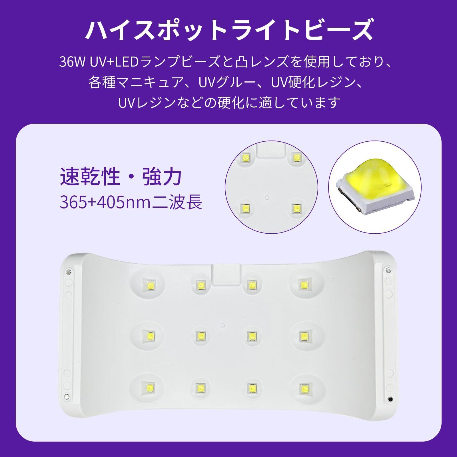 【速乾性・強力】ネイルアートランプは36W UV+LEDランプビーズと凸レンズを使用しており、短時間で効果的かつ一時的に硬化できます。 各種マニキュア、UVグルー、UV硬化レジン、UVレジンなどの硬化に適しています