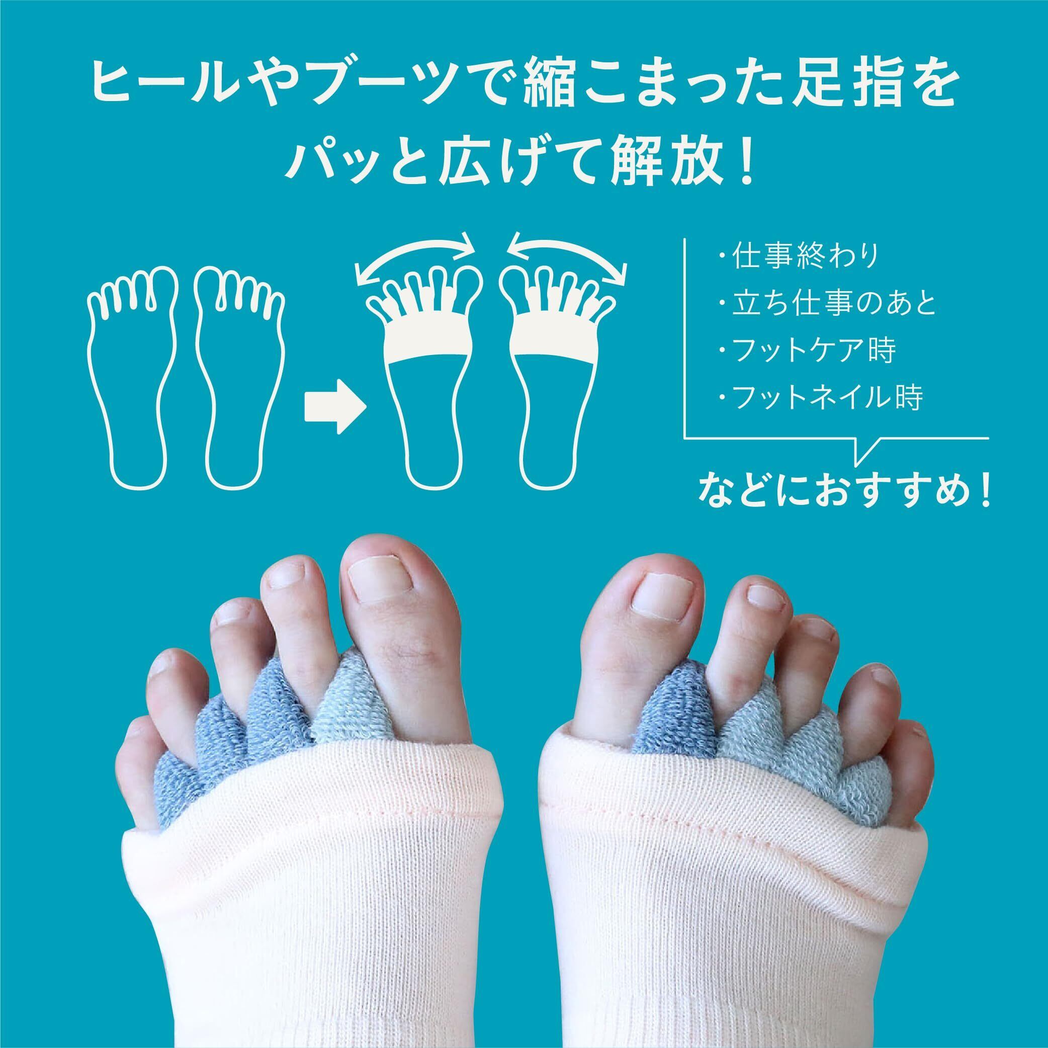 左右どちらの足にも迷わず履けるよう、親指と人差し指部分が色違いになっているのもポイント。スムーズに履けるので“休む時間も大切にしたい”という忙しい日常の中でも気軽に取り入れられます。指間をやさしく広げ、足を休ませたい方におすすめ