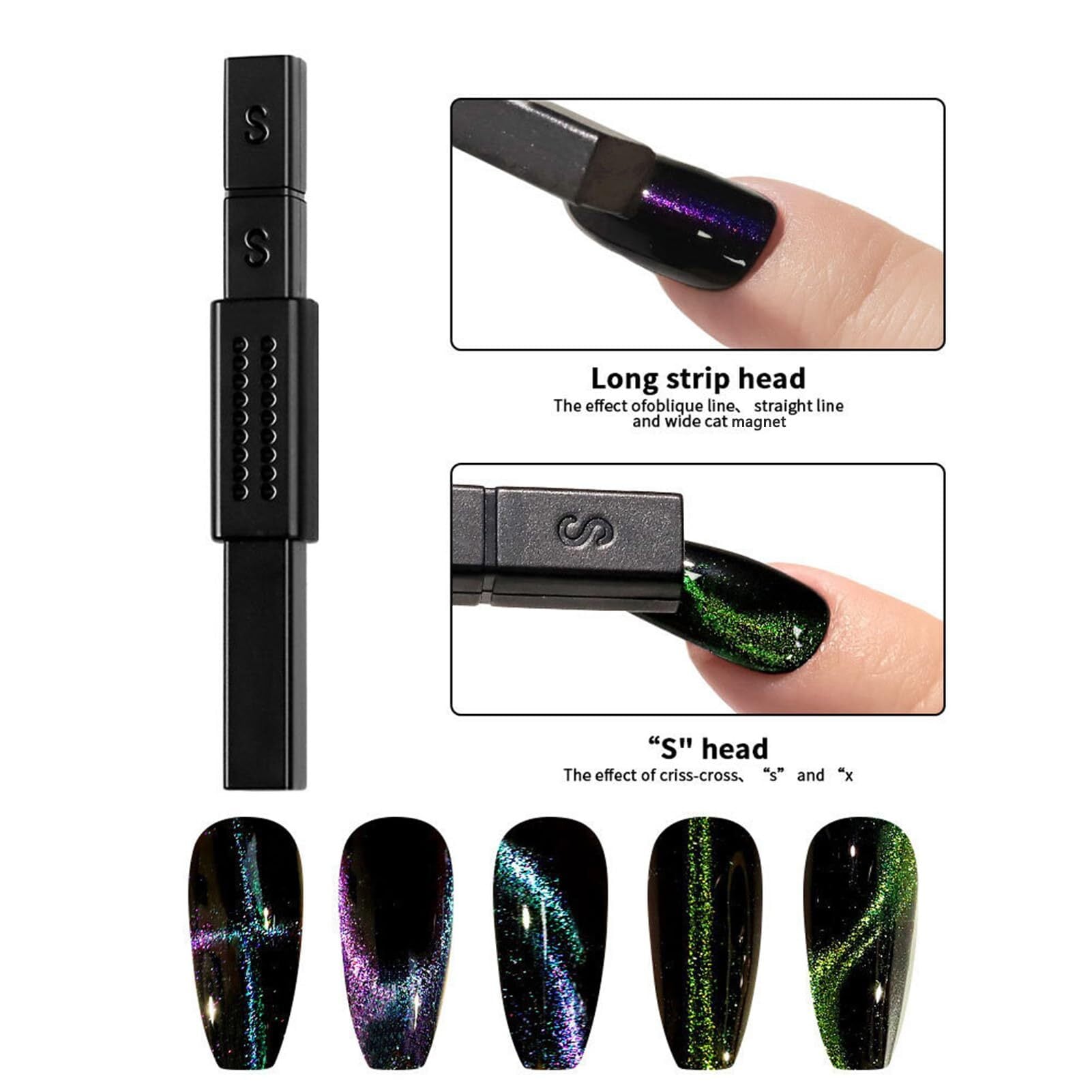 使い方簡単:マグネットネイルポリッシュまたはジェルポリッシュを爪に塗り、ネイルマグネットを濡れたポリッシュに近づけるだけで、お好みのキャットアイ効果が得られます。詳しい手順については、製品ビデオをご覧ください。