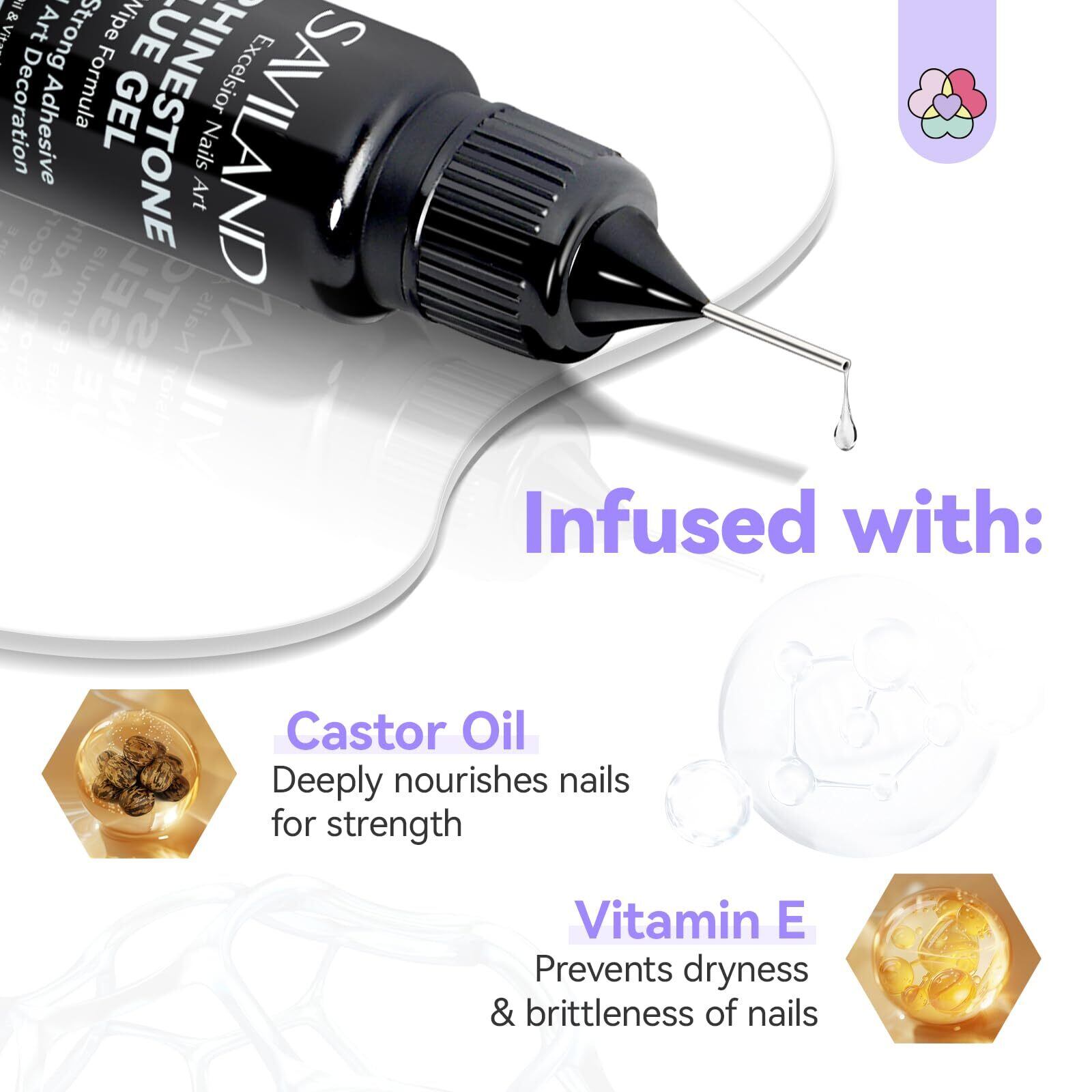 天然成分が爪を保護:ヒマシ油とビタミンEが豊富に含まれており、不快な臭いがなく、ネイルラインストーンを強力に接着し、爪の損傷のリスクを軽減し、より安全で楽しいマニキュア体験を保証します。