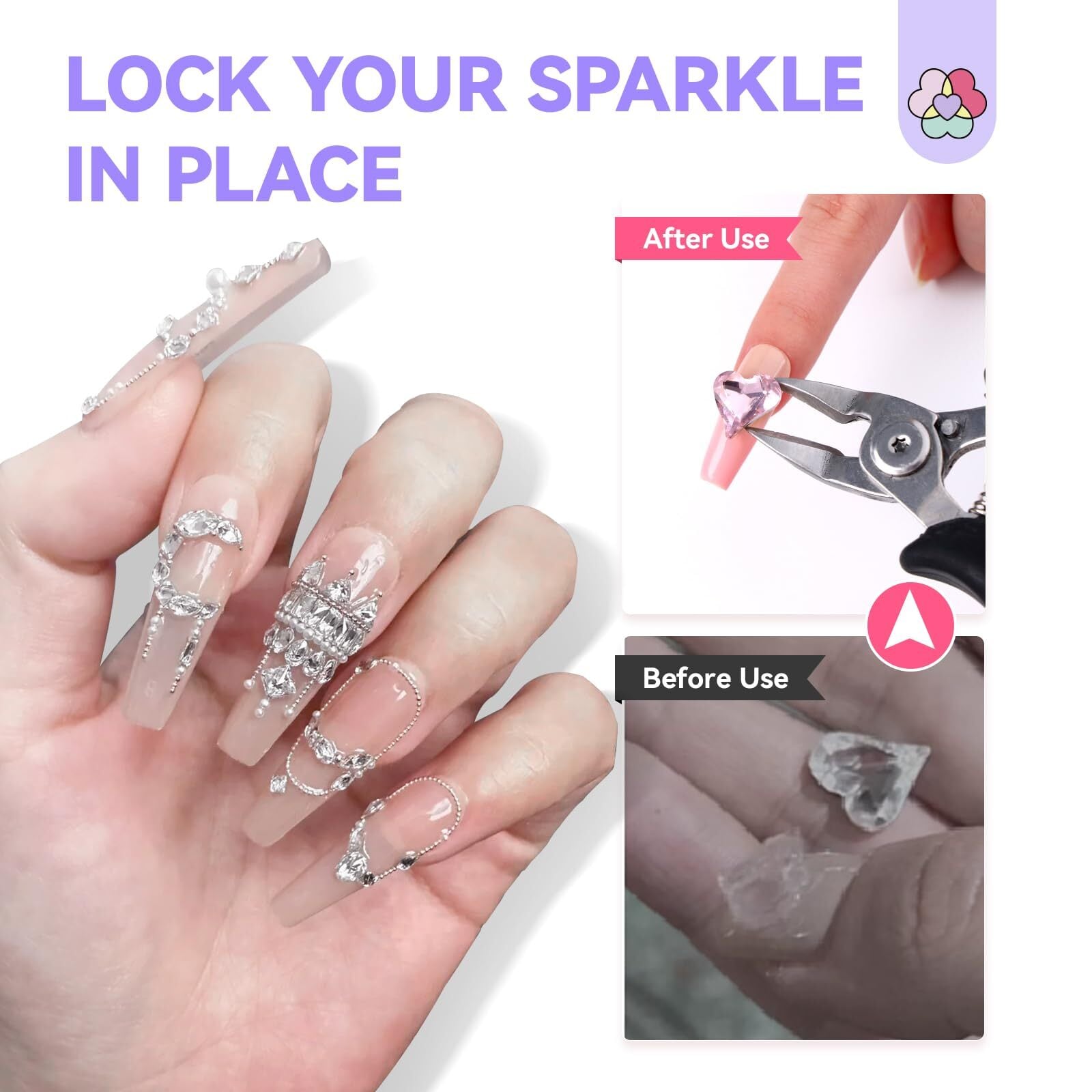 長持ち&落ちにくい:ピンホールスクイーズ接着剤を使用しており、宝石、ジュエリー、ビーズ、ネイルラインストーンを爪に固定するのに適しており、傷がつきにくく落ちにくく、髪の毛や繊維に絡まりません。