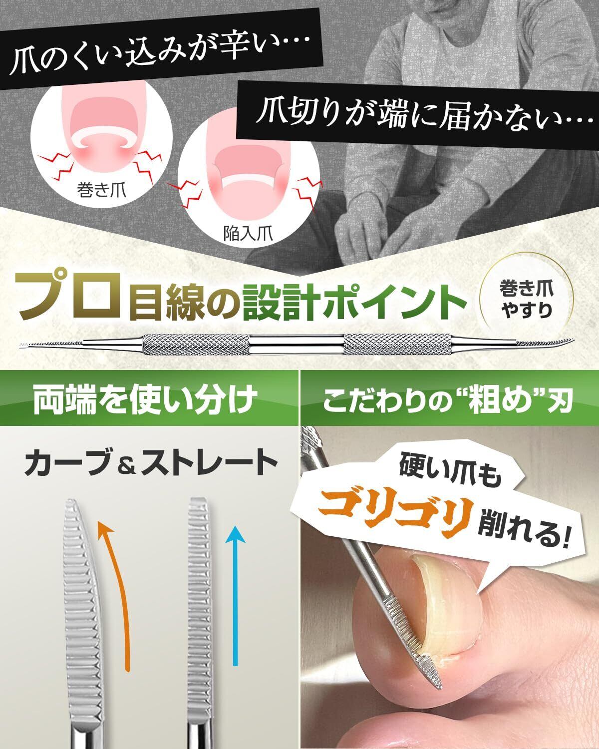 爪垢取り①【最適な角度と厚み】最適な角度(カーブ)により操作性が向上。また、薄型設計のサジにより爪と指の間にスムーズに入り込みます。力を入れずに爪垢を取り除くことができ、効果的なフットケアが可能になりました。②【左右非対称設計】右利きでも左利きでも問題なく使用可能。また、自分自身でのケアはもちろん、他人によるケアもストレスなく行えます。左右対称のデザインに比べ、使いやすさと効率性が向上しました。