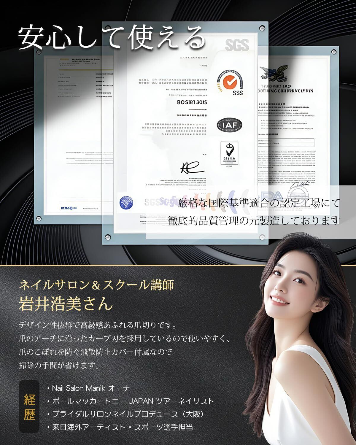 ️【高耐久ステンレス刃仕様】本爪切りの刃は日本製 420J2 高品質ステンレスを採用。ナノミスナイフ技術で刃のずれを 0.2mm に抑え、磨耗を最小限に防ぎながら長期間切れ味を持続。爪のカーブにフィットする弧状刃設計で、直線刃より滑らかに切断し、爪の欠けや割れを確実に防ぎます。10 年使用後も切れ味が低下しない高耐久性で、長期的な信頼性をお約束します。