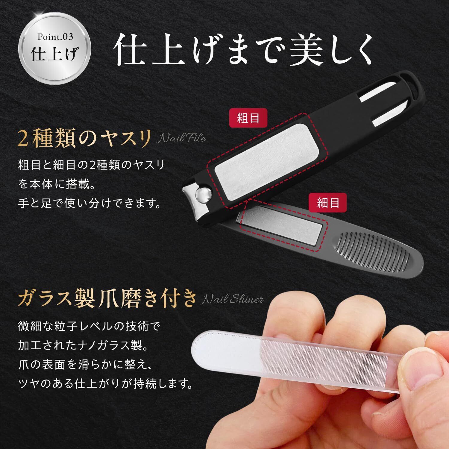 【2種類のヤスリ・ガラス製爪磨き付き】粗目と細目の2種類のヤスリを本体に搭載しています。手と足で使い分けできます。微細な粒子レベルの技術で加工されたナノガラス製爪磨きも付属しています。爪の7表面を滑らかに整え、ツヤのある仕上がりを持続します。
