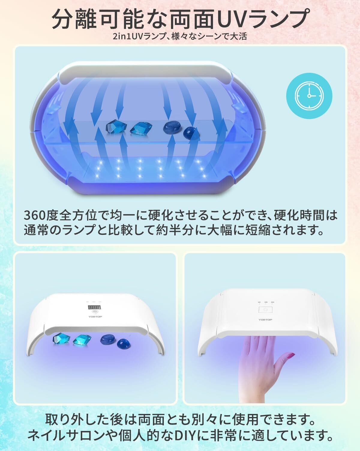 【最新モデルのパワフルなUVライト】YOBTOPの最新モデルは、48Wの強力な出力で、UVレジンやジェルネイルを素早く硬化させます。プロフェッショナルな仕上がりを追求するDIY愛好者から、ネイルアーティストやレジンアーティストまで、誰もが高品質な効果を得ることができます。(付属のアダプターをご使用ください!)
