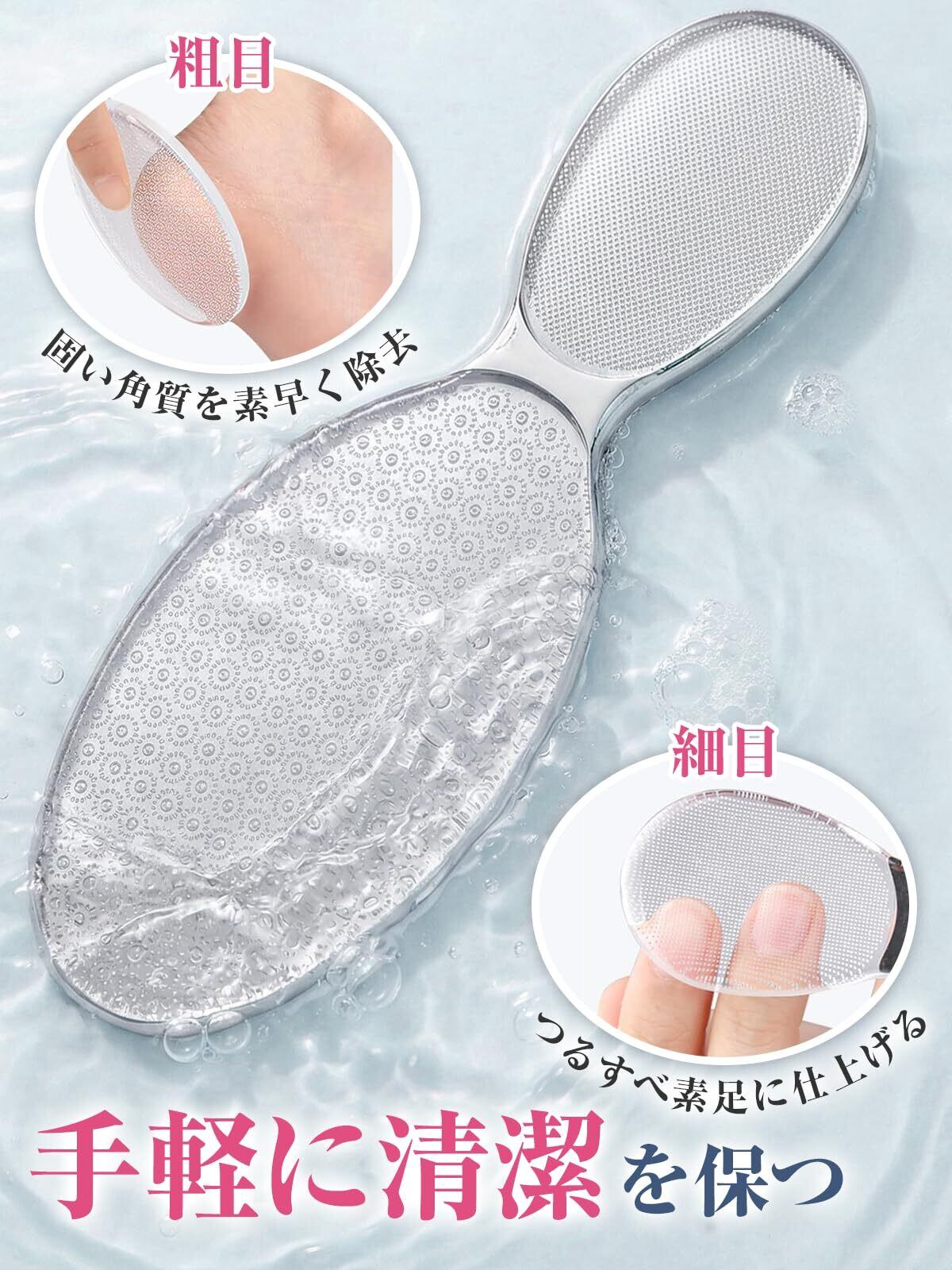 かかと削り 角質取り かかとやすり 角質除去 足やすり 踵の角質除去 角質ケア かかときれい 足裏 粗/細2面 ナノガラス製 防水 風呂 丸洗いOK つるつる なめらか 厚型クリア材質 ハンドル型