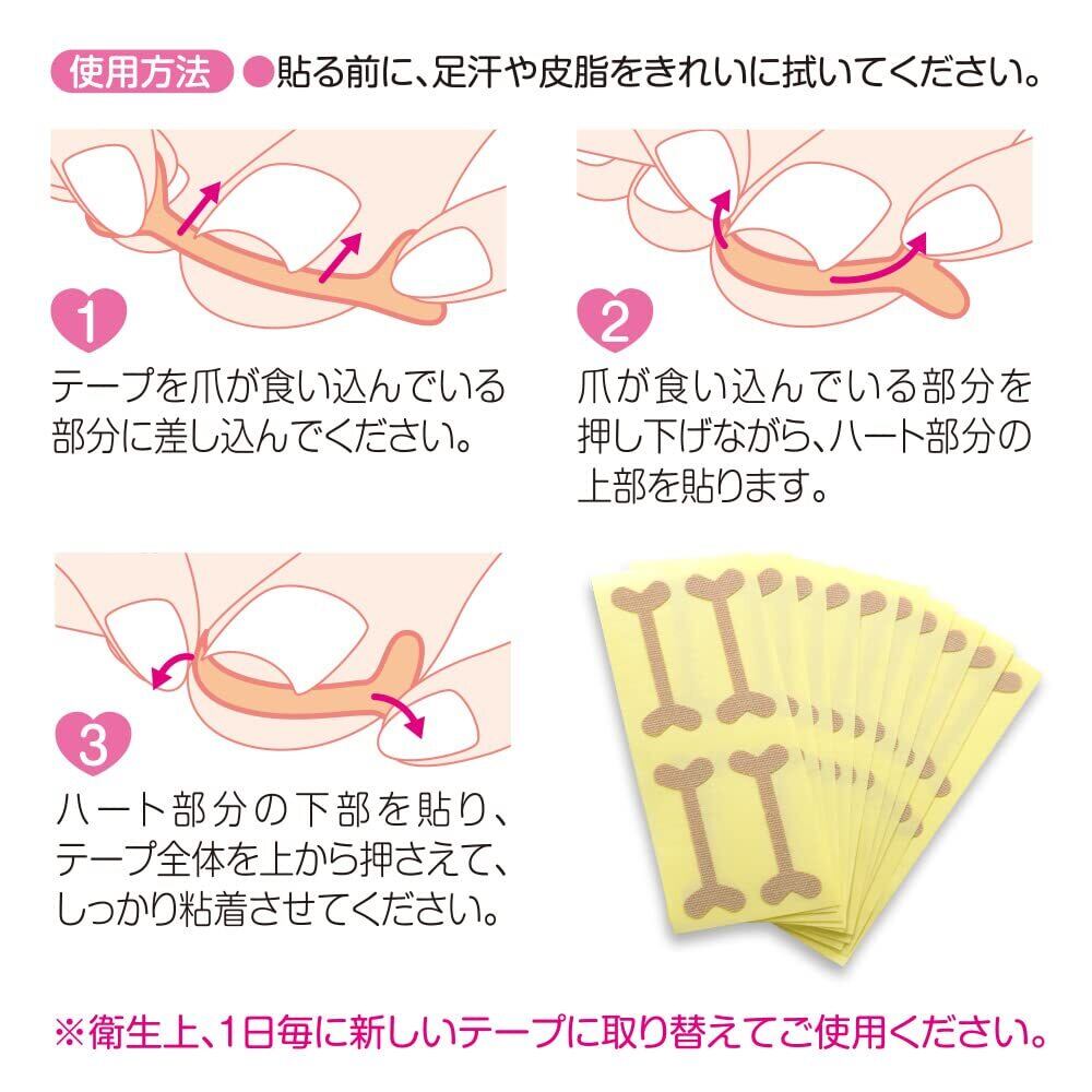 ※貼る前に、足汗や皮脂をきれいに拭いてください。 1.テープを爪が食い込んでいる部分に差し込んでください。 2.爪が食い込んでいる部分を押し下げながら、ハート部分の上部を貼ります。 3.ハート部分の下部を貼り、テープ全体を上から押さえて、しっかり粘着させてください。