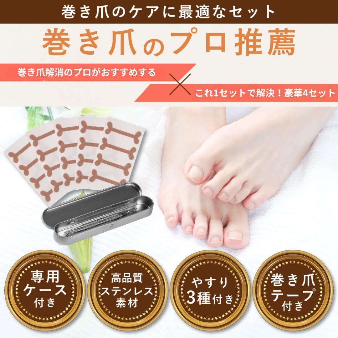 これ一つで巻き爪ケアは充分!という4点セットをご用意致しました。このセットには爪垢取りと爪やすり、巻き爪用テープが含まれており、特に巻き爪を持つ方々に有効なケアを提供します。