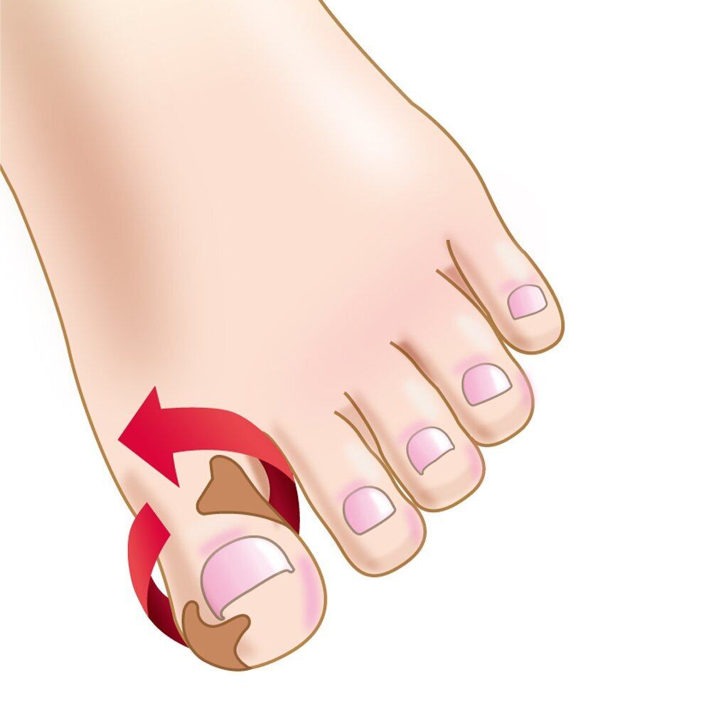 (2) 剥離紙を半分はがし、巻き爪部分にテープ先端を合わせて貼ります。