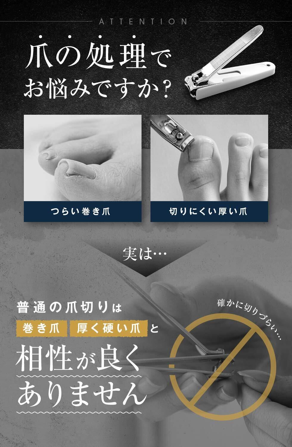 刃先が鋭利でカーブした形状なので、巻き爪用として最適です。硬い足の爪や変形爪などの切りにくい爪でも、切りたい部分を狙って切る事が出来ます。