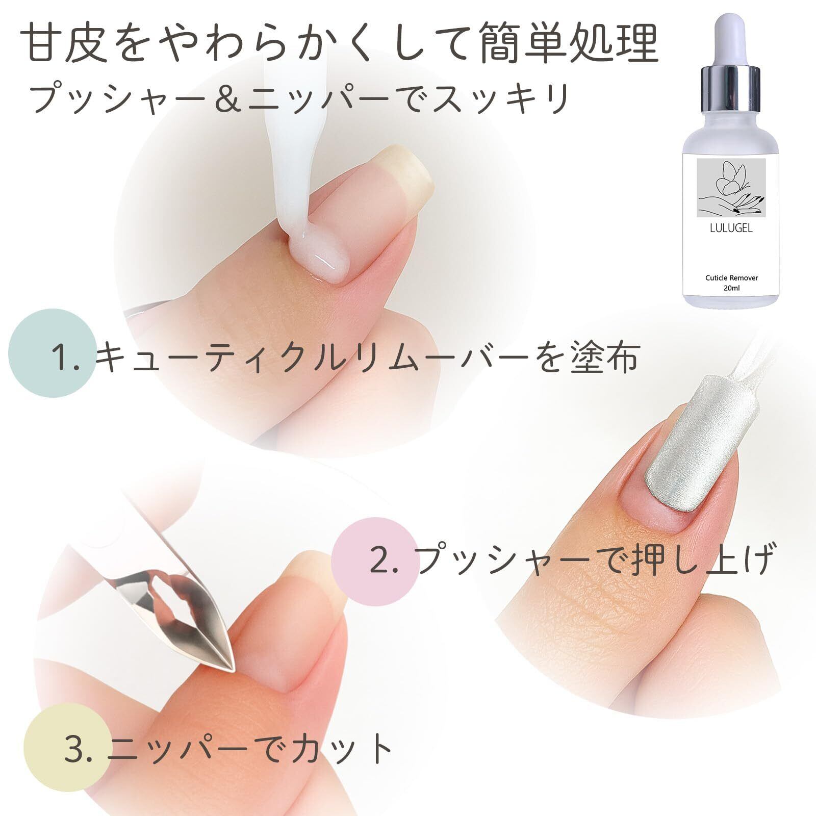 【甘皮処理に必要なものをまとめたセット】キューティクルリムーバーで甘皮をやわらかくし、キューティクルニッパー・甘皮ニッパーで処理できる甘皮処理セットです。セルフネイルで甘皮ケアを始めたい方にも使いやすい内容です。