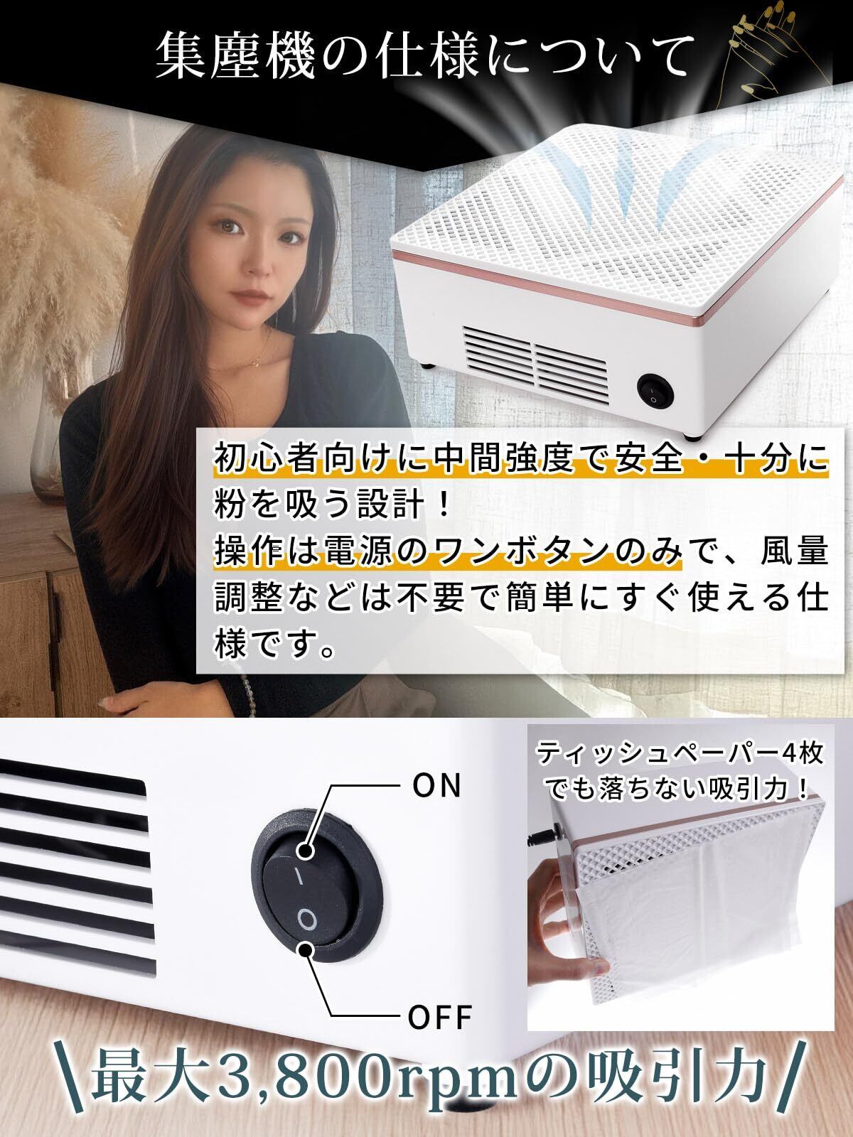 集塵機は、電源のワンボタンのみで、風量調整などは不要で簡単にすぐ使えるシンプル設計!60Wのパワフルなモーターを搭載し、回転数は最大3800rpm。電力消費を抑えた省エネ設計で、パフォーマンスとエコロジーを両立!