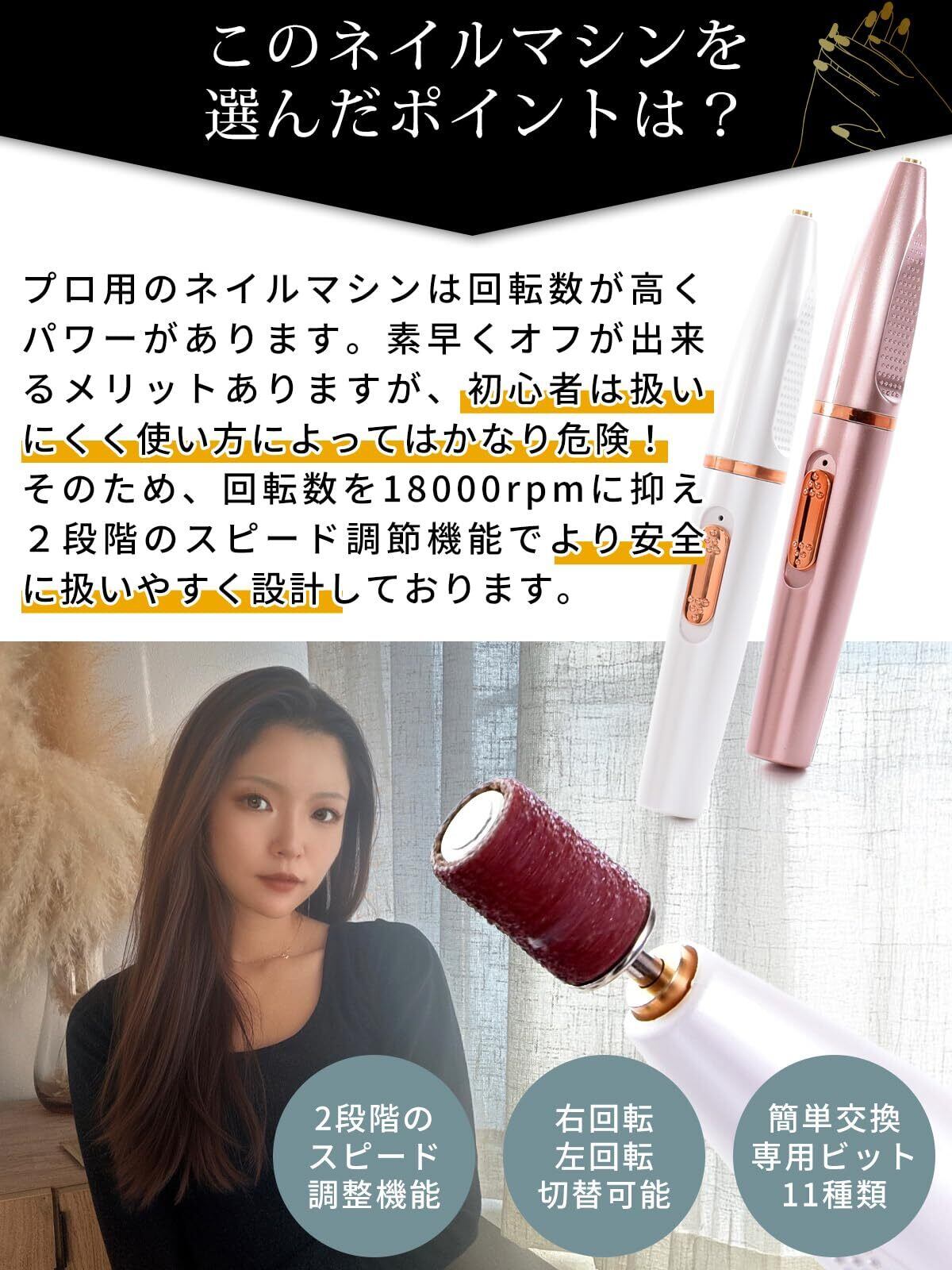 ネイルマシンは18000rpm回転となっており、初心者専用として設定開発しております。2段階のスピード調節機能でより安全に!USB充電式で11種類のビットを付属しております。
