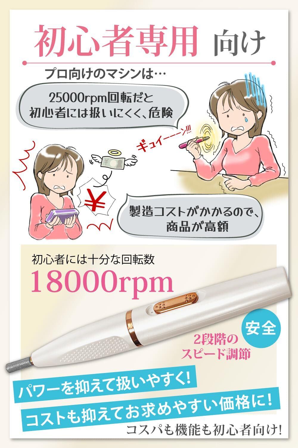 回転数を18000rpmに抑え、2段階のスピード調節機能でより安全に扱いやすく設計しております。コスパも機能も初心者向けに作っております。
