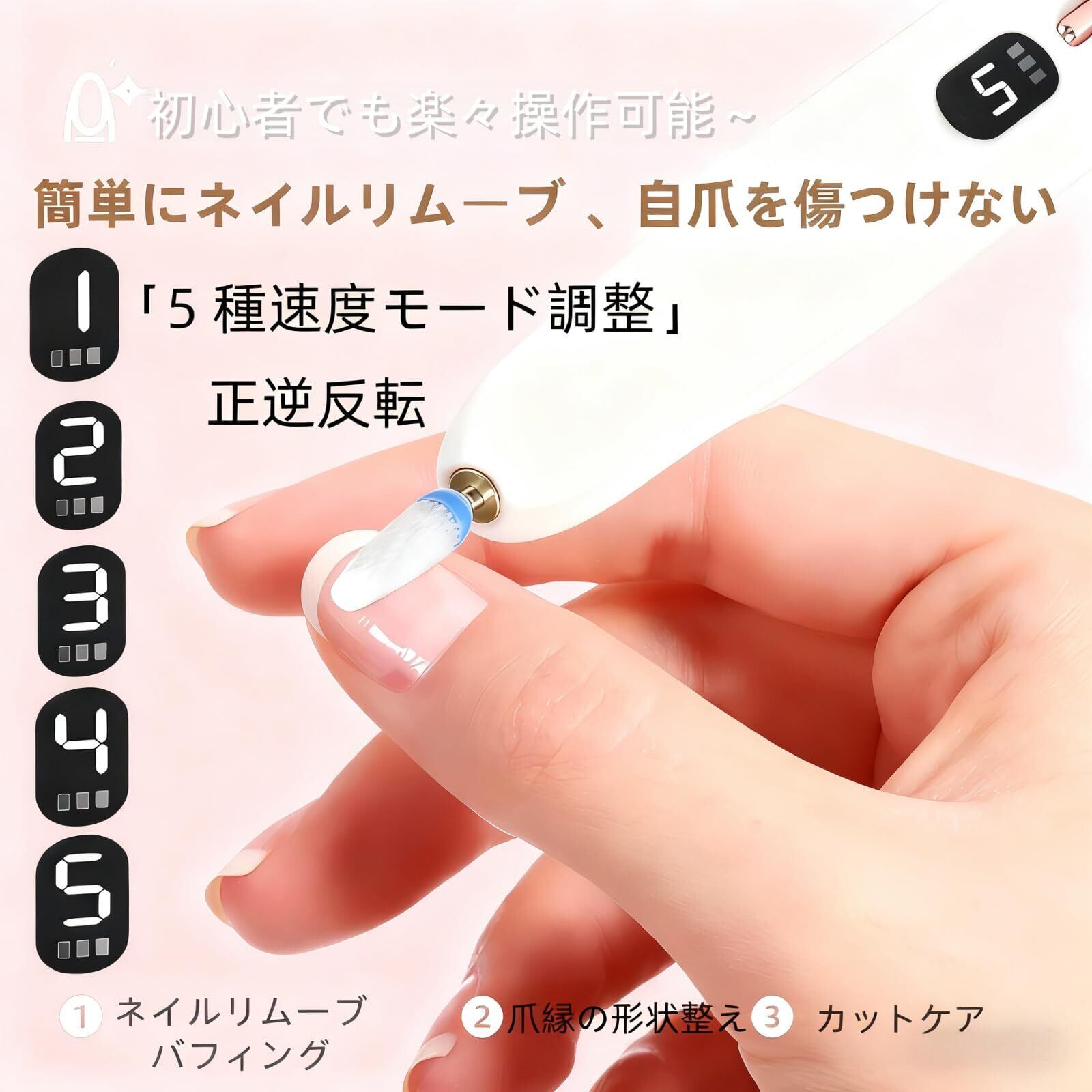 【5 段階速度調整 + 正逆反転機能】:このネイルデバイスは 5 段階の速度モードと正逆反転機能を搭載しています。1 段階目はネイルリムーバーバフィング、2 段階目は爪縁の形状整え、3 段階目はカットケアといったように、用途に応じて速度を微調整できます。また正逆反転機能により、利き手が右利きであれ左利きであれスムーズに操作できます。初心者でも複雑な設定は不要で、ワンタッチで自分に合った速度に調整し、爪を傷つけることなく安心してネイルケアを行うことができます。