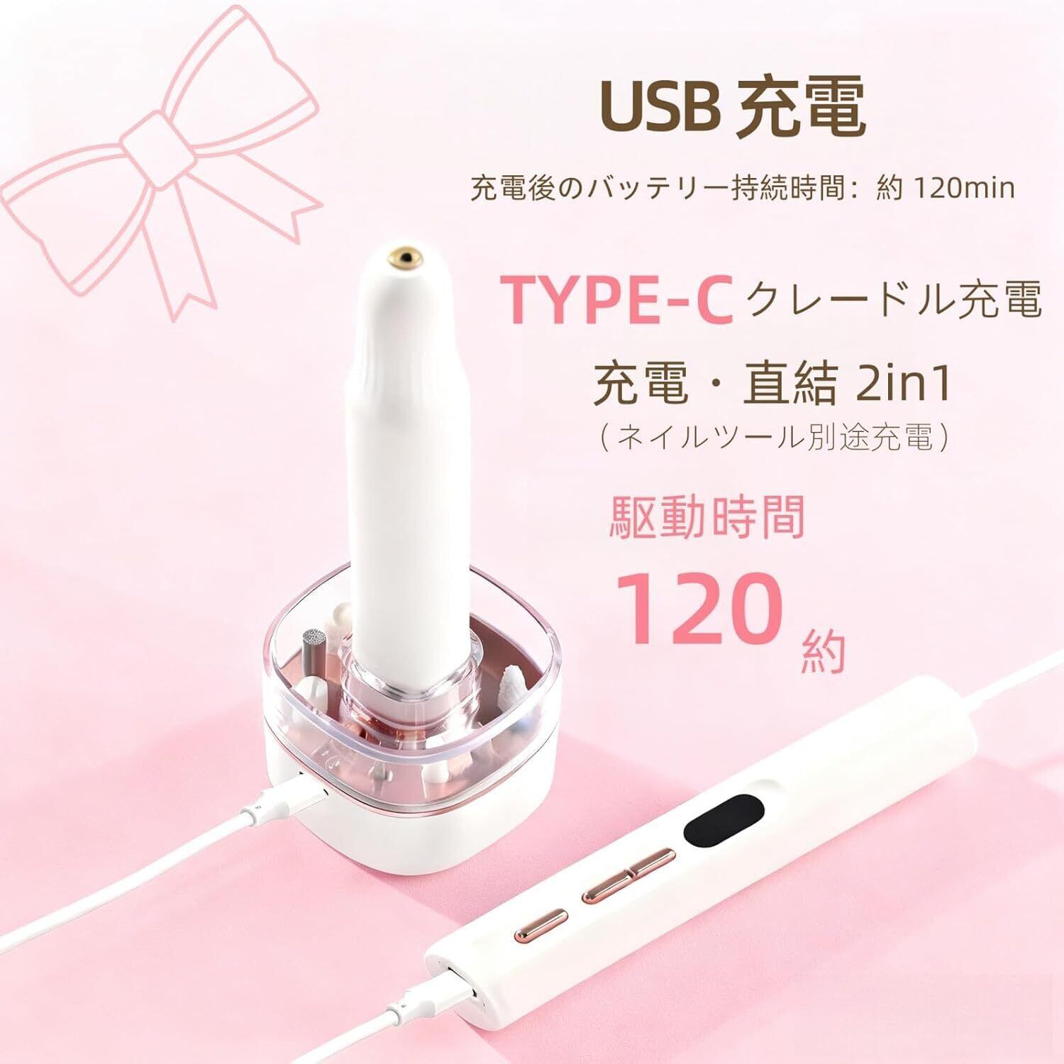 【Type-C 充電 & 長時間駆動】:Type-C 充電方式に対応し、満充電で約 120 分間連続使用することが可能です。充電一次で複数回のネイルケアやネイルアート作成に対応できるため、頻繁な充電の手間を省けます。コードレス設計なので、使用場所に制限はありません。自宅のリビングで、オフィスのデスクで、あるいはカフェの片隅でも、いつでも気軽にネイルケアを行い、美しい爪を維持することができます。