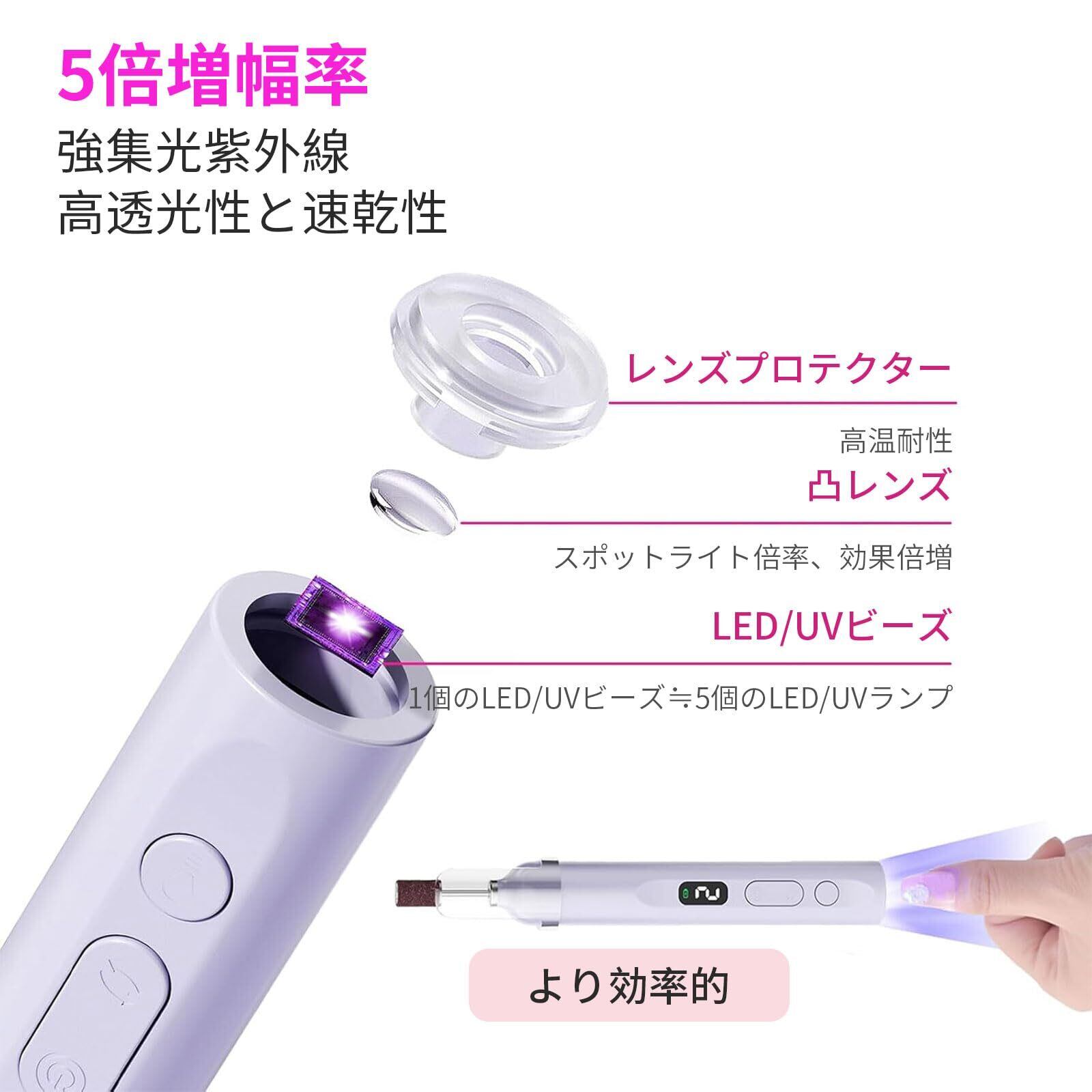 【UVランプ設計】ドリルの反対側にUVランプを設置し、60秒後に自動的に消灯するように設計しました。道具を変えずに爪を乾かすことができ、日常旅行の手伝いになります。コンパクトで持ち運びしやすく、友人や家族と一緒に自宅でDIYするのに適しています
