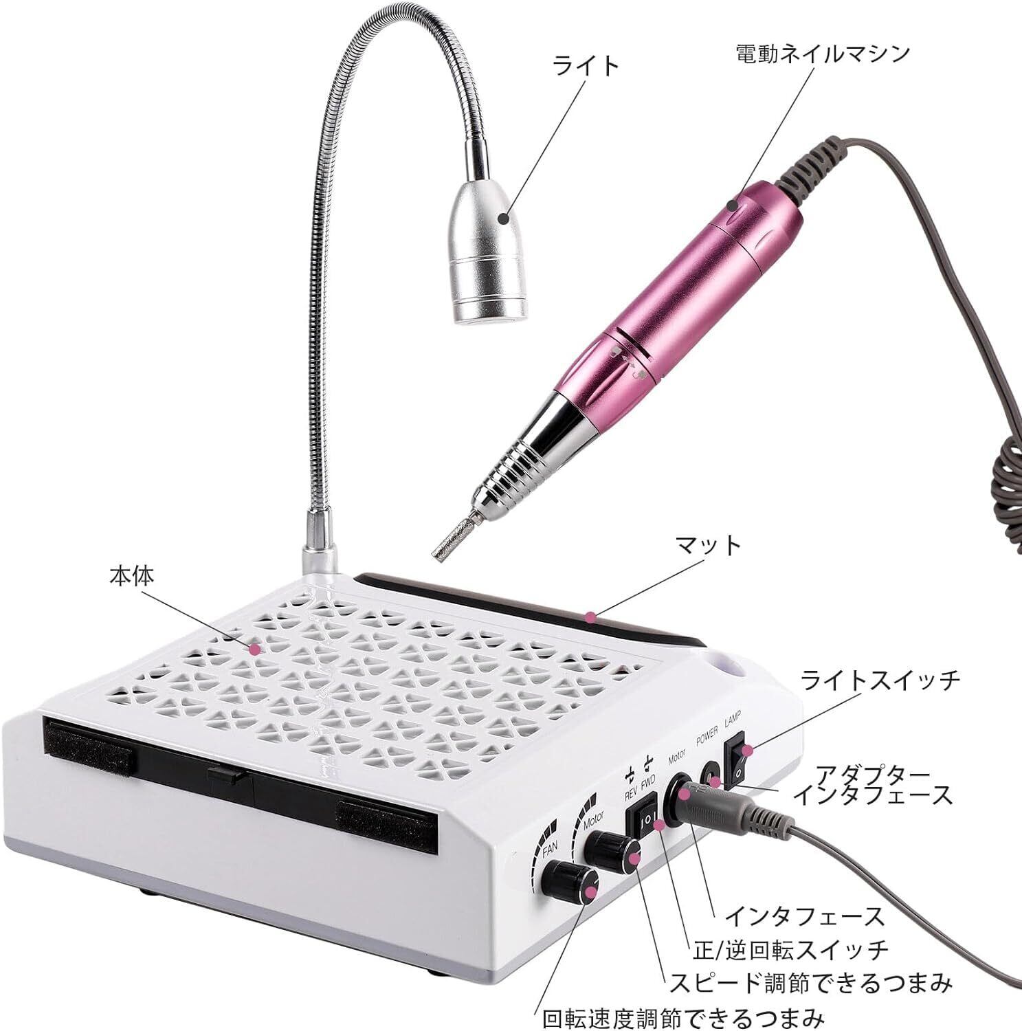 【商品について】セット内容:ネイルダスト集塵機*1、アダプター*1、ライト*1、ネイルマシン*1、ネイルマシンビット*6、ネイルマシンサンディングバンド*20、ダストブラシ*1、爪やすり*1、日本語説明書*1