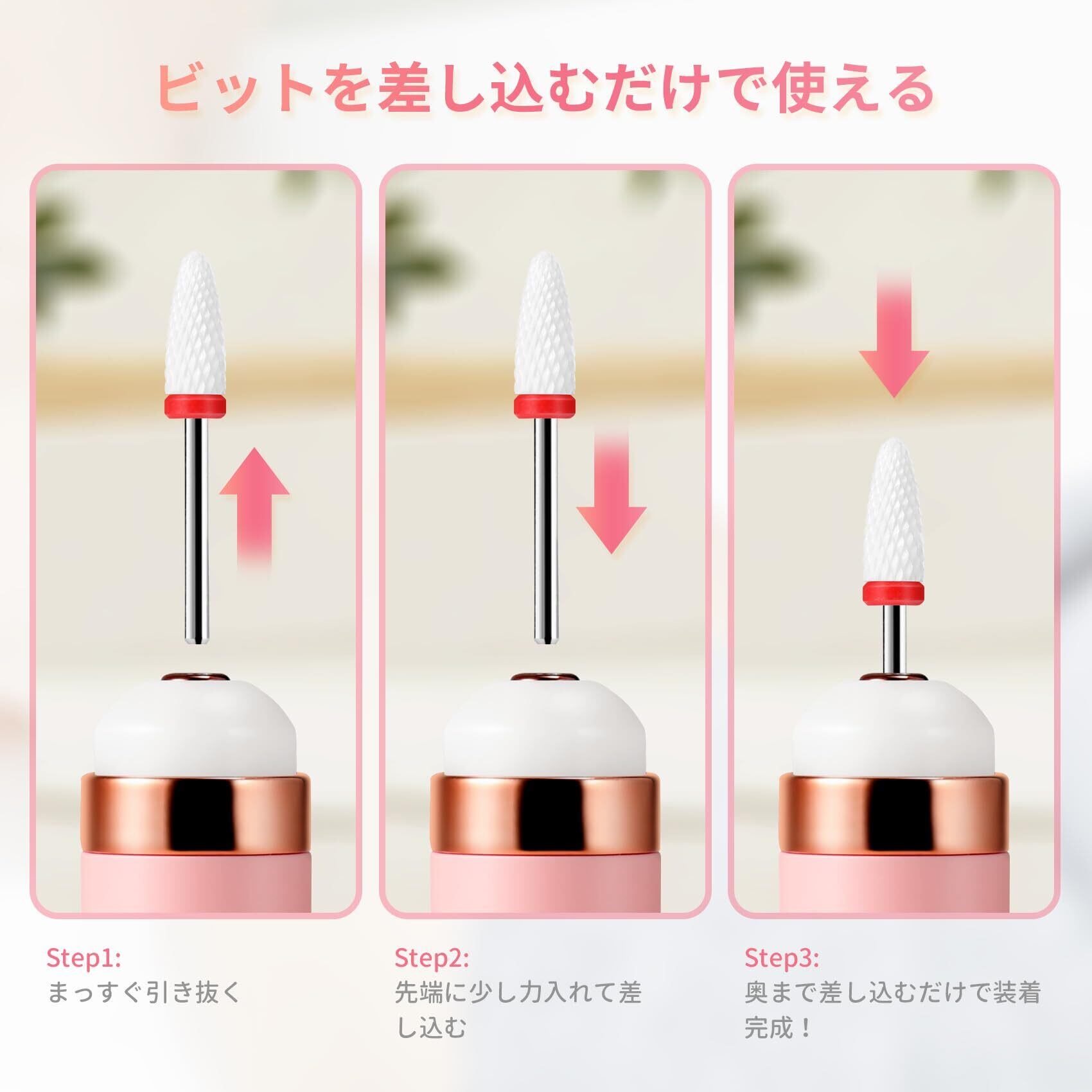 使いやすさ&収納:軸径2.35mmでほとんどのネイルマシンに対応。ネイルケアビットの取り付けも簡単です。付属のコンパクト収納ケース付きで、持ち運びや保管もスッキリ