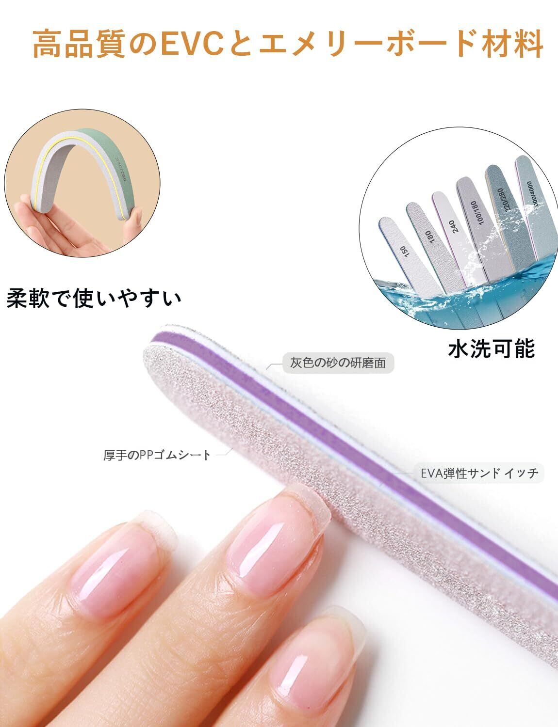 【爪やすり+爪磨き】:セットには150、180、240、100/180、200/280、1000 / 4000グリットがある。ジェルネイル必需品の100/180gは自爪、人工爪表面の凹凸を滑らかに整えますが、1000/4000gはすごく細かいヤスリで、ピカピカにする前の最終段階に使用します。