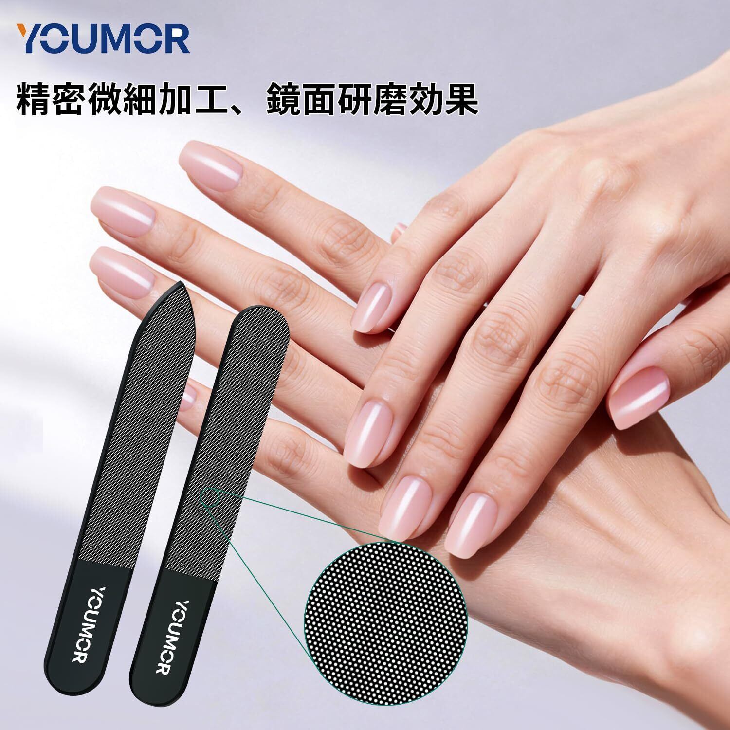 【精密なマイクロ加工によるミラー仕上げ】 爪ヤスリの表面にはレーザー微細エッチング加工を採用しています。一本一本の溝の深さと角度は科学的に計算されており、均一でなめらかな研磨力を実現します。鏡のようなツヤのあるネイルに仕上がり、その輝きは約2週間~1か月維持することができます。