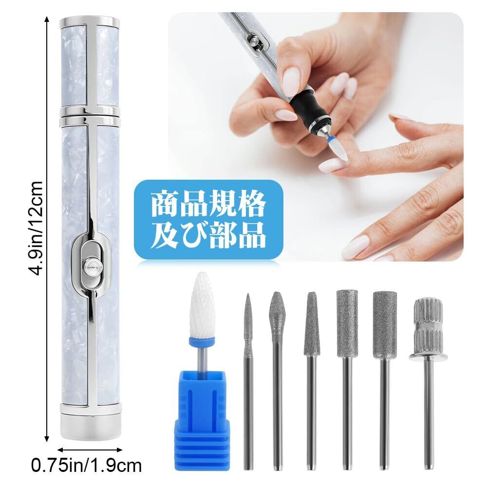 電動爪やすりの使用方法 1. ヘッドを交換して、必要なヘッドを装着します。 2. ネイルファイルを充電して、使用可能な状態にします。 3. ネイルファイルを手に持って、爪に当てます。 4. 時計回りか反時計回りのギアを選択して、爪を研磨します。 5. ネイルファイルを使い終えたら、充電しておきます。