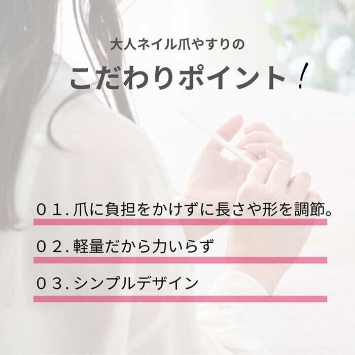 1. 爪を軽く持ち、爪やすりの表面を爪に当てます。 2. 爪の長さや形を整えるように、ゆっくりと爪を引っ張ります。 3. 必要に応じて、裏面のグリッドも使用します。 4. 使用後は、清潔な場所に保管してください。