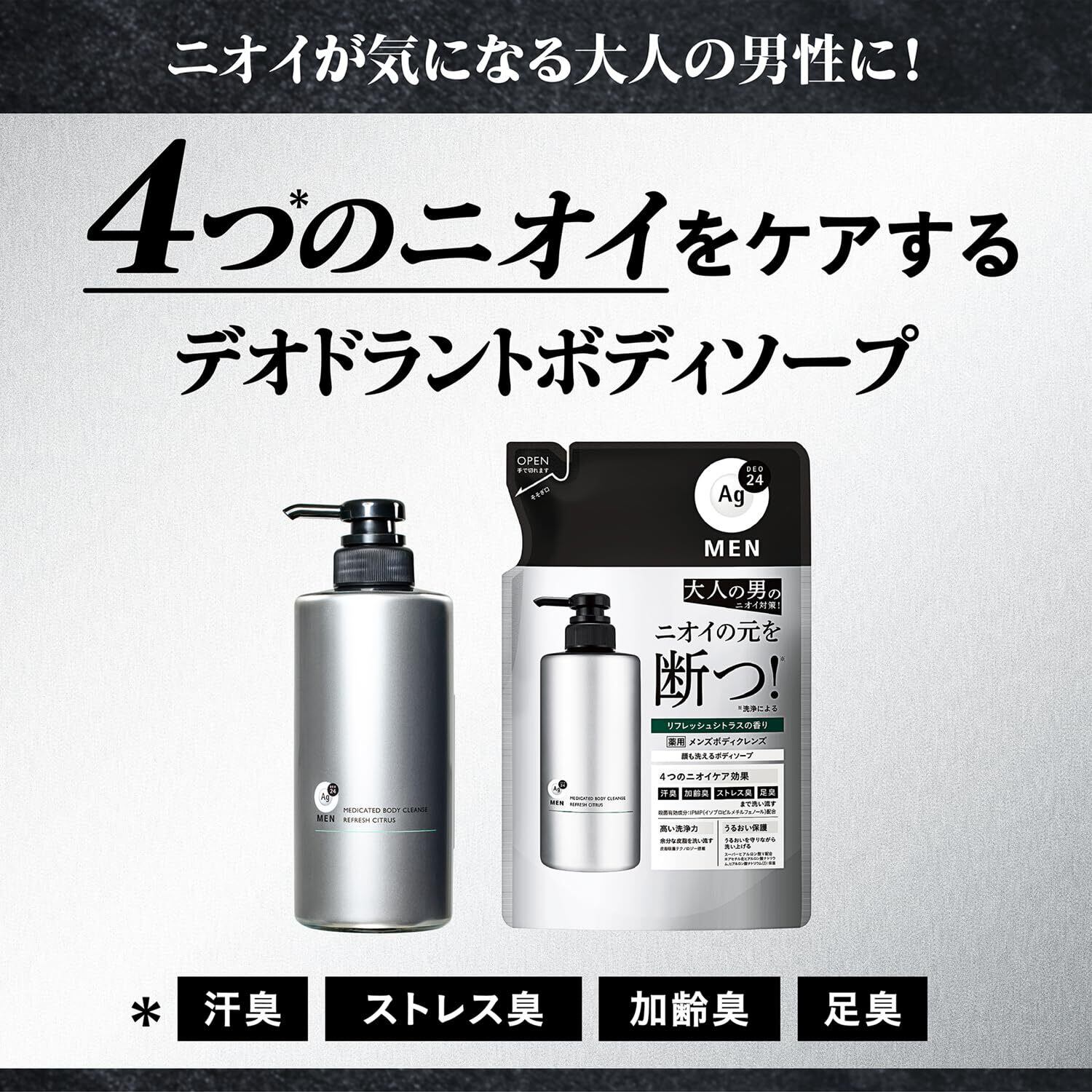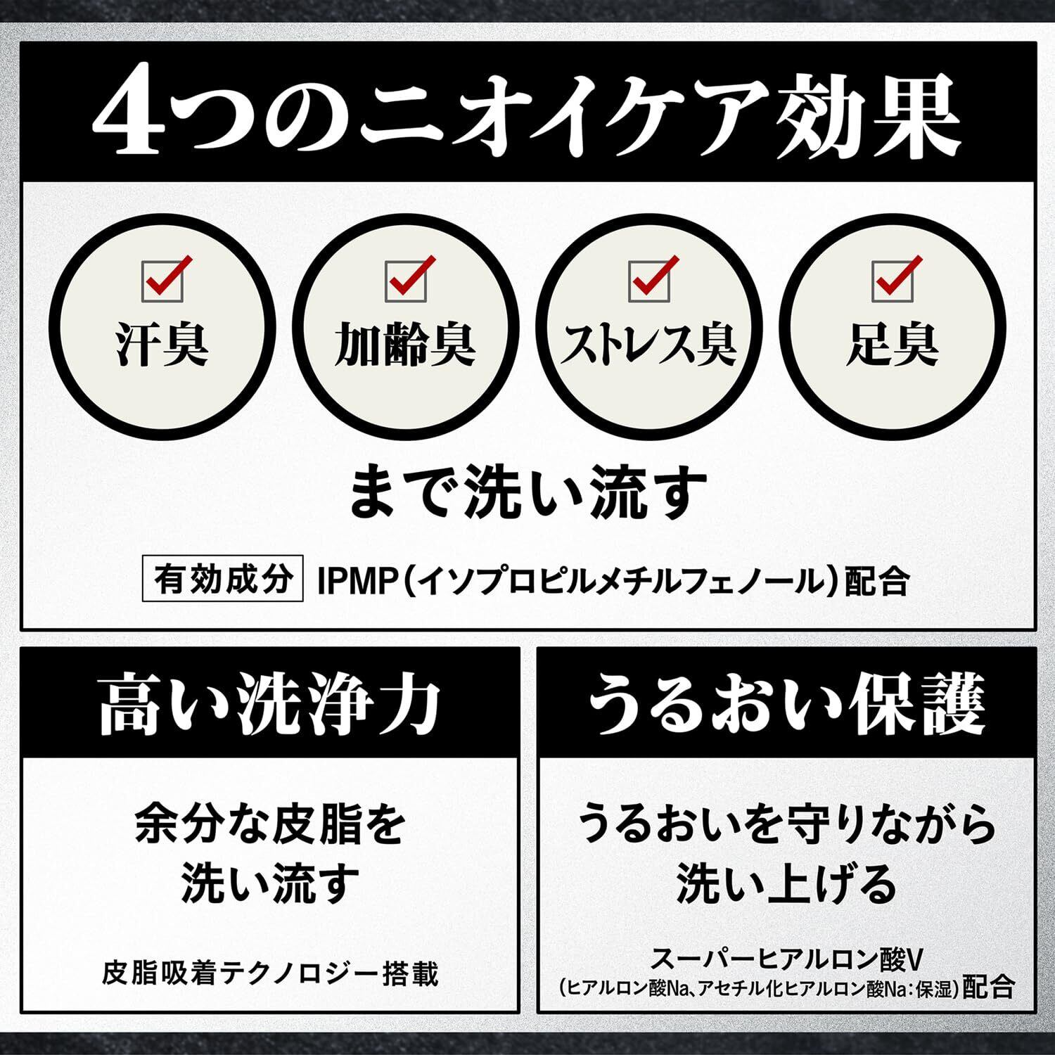 【4つのニオイケア効果】汗臭、加齢臭、ストレス臭、足臭まで洗い流す。殺菌有効成分:IPMP(イソプロピルメチルフェノール)配合