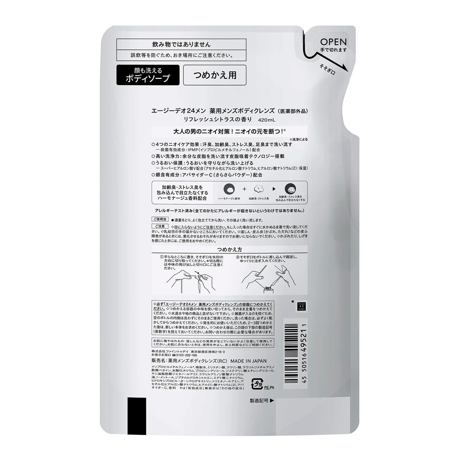 【在庫処分】【限定】エージーデオ24 【まとめ買い】メン 薬用メンズボディクレンズ 詰替え 420mL×2+おまけ ボディーソープ 薬用 ニオイ対策 体臭 足臭 加齢臭 メンズ 泡 保湿 背中ニキビ 顔も洗える