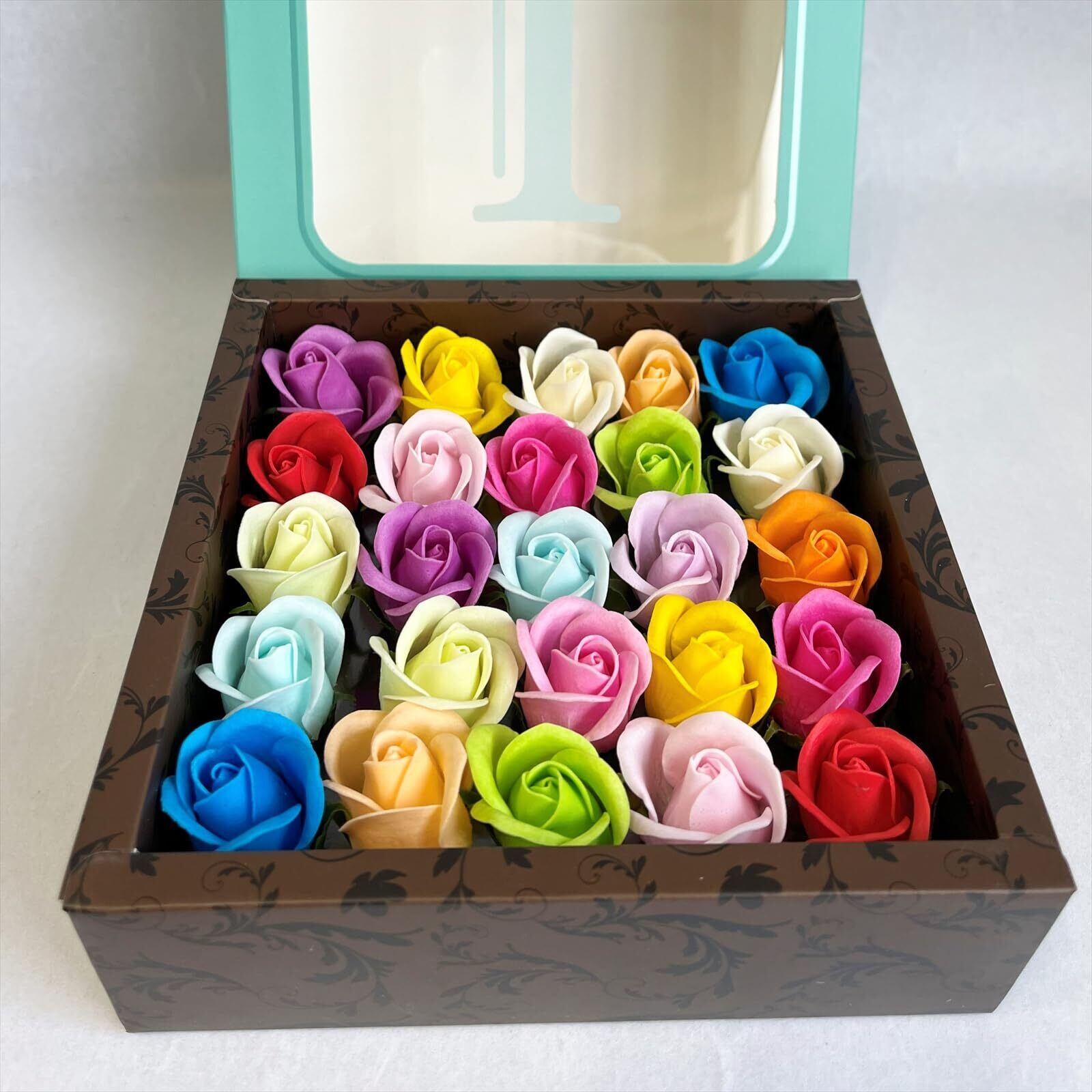 特別なギフトデザイン:窓から見えるカラフルなローズと、ボックスの小窓にあしらわれたアルファベットが、特別感のある贈り物にぴったりです。