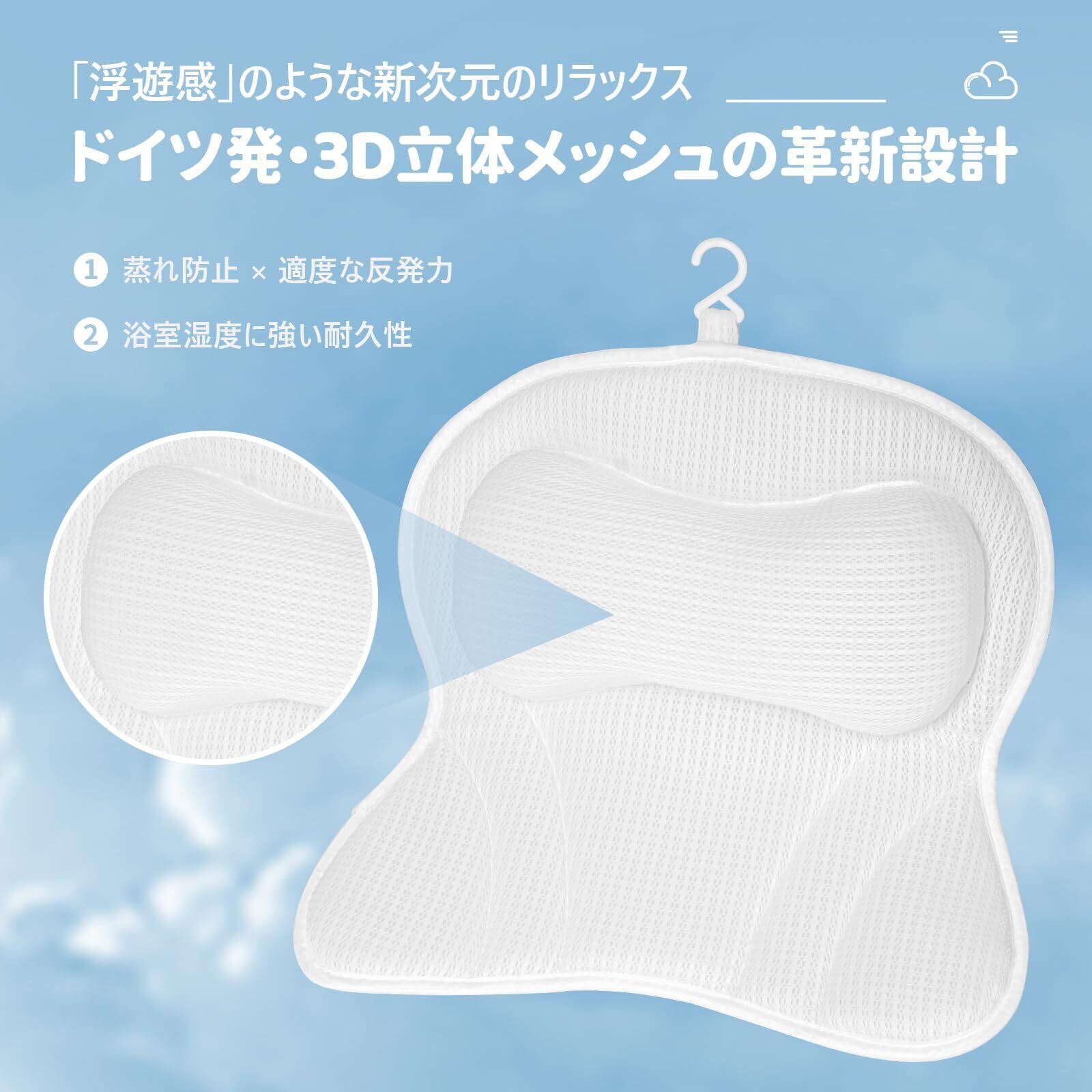 【先進の3Dエアーメッシュ技術】 このバスピローは、通気性と速乾性に優れた3Dエアーメッシュ素材を使用しています。お風呂や浴槽に使用後、素早く乾燥するため、常に清潔な状態を保つことができます。湿気がこもりにくく、カビの発生を防止するので、衛生的に使用し続けることができ、長期間にわたり安心してお使いいただけます。