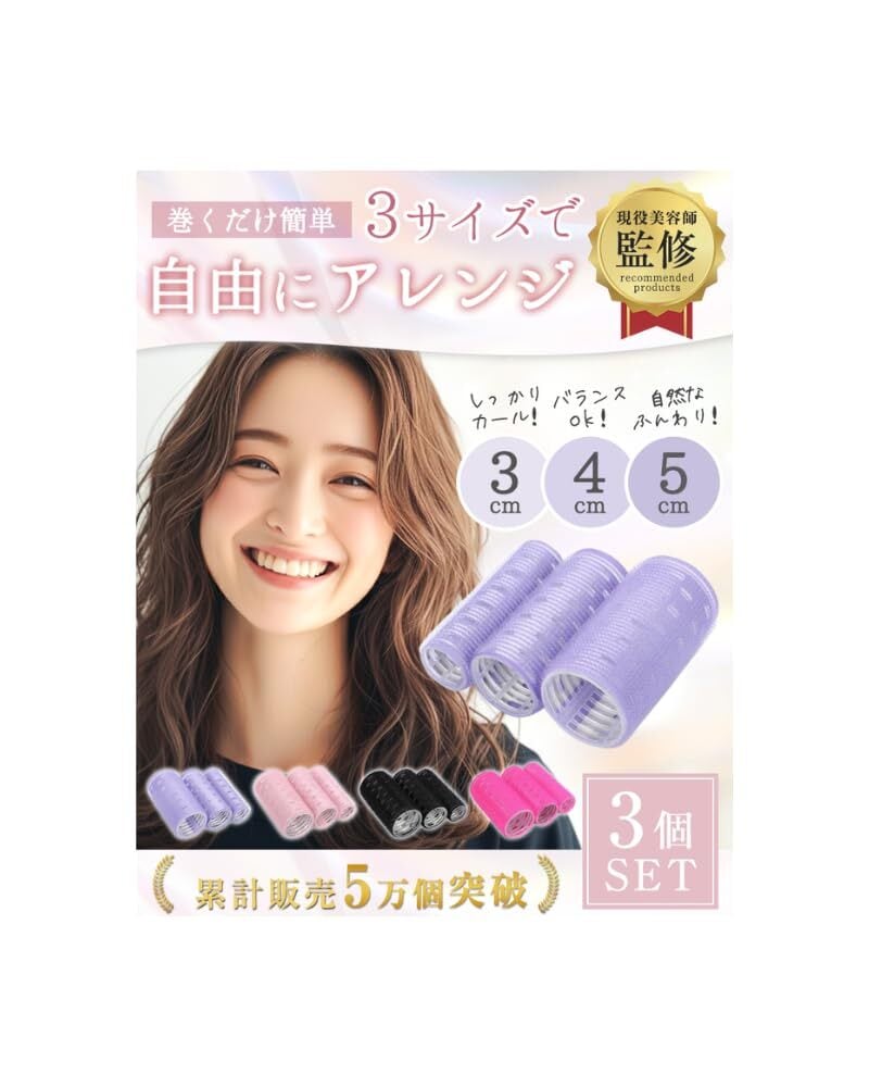 【3サイズセットで思い通りの“くるん”を】3cm・4cm・5cmの3個セットで、前髪・トップ・サイドまで自由にアレンジ可能。細めの3cmは短め前髪やサイドバングに、4cmは王道“くるん前髪”に、5cmはふんわりボリュームアップに最適。1セットで外巻きも内巻きもできるから、学生さん・ママ向け・不器用な方まで幅広く使えます。