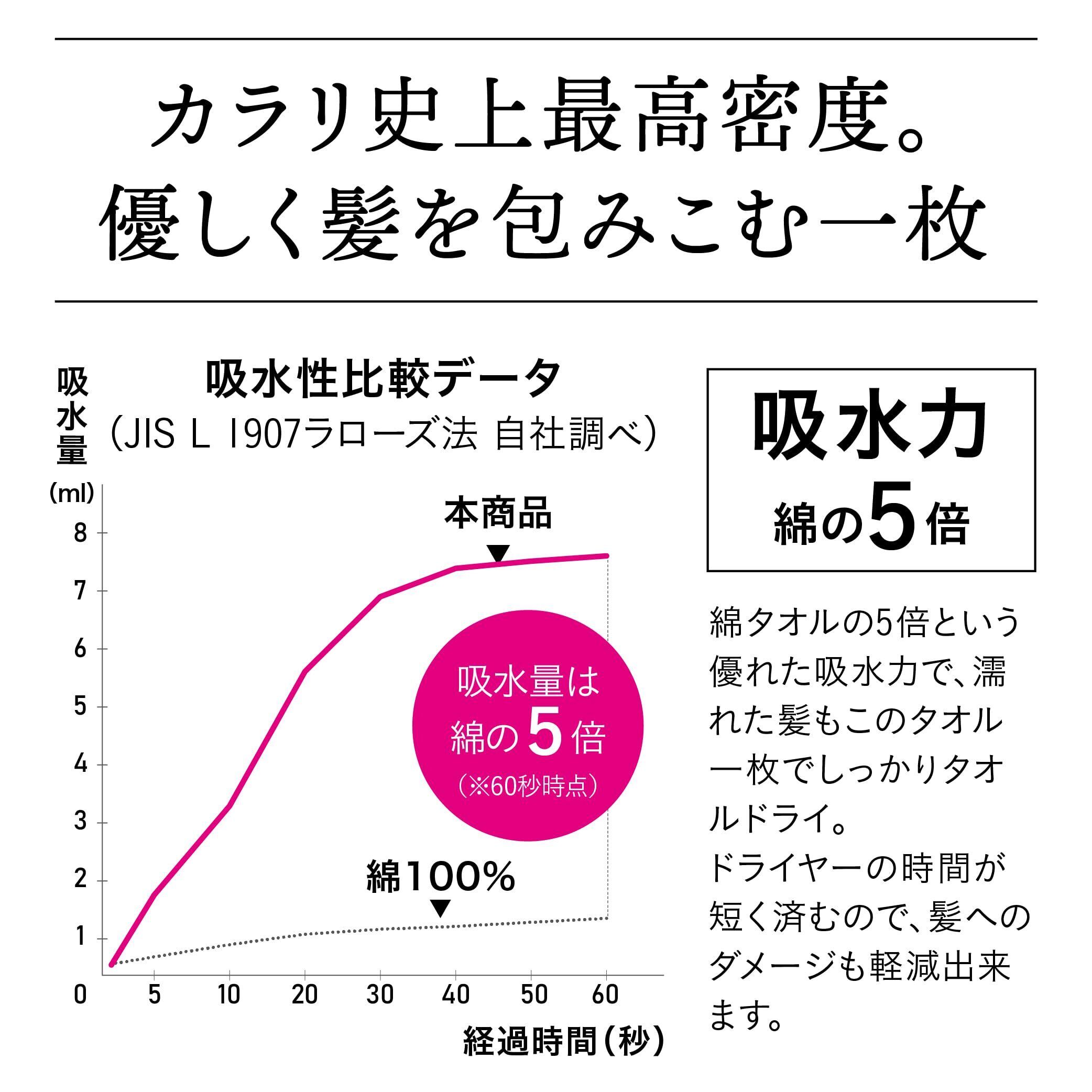 【ドライヤー時間を短縮】髪のために作られた特別なタオル。1枚で1.5Lもの水を吸水し、綿タオルの5倍の吸水力を発揮します(自社調べ)。お風呂上がりの濡れた髪を包むだけで水分をぐんぐん吸い取り、ドライヤー時間を大幅に短縮。摩擦や熱によるダメージを減らし、髪をやさしく守ります
