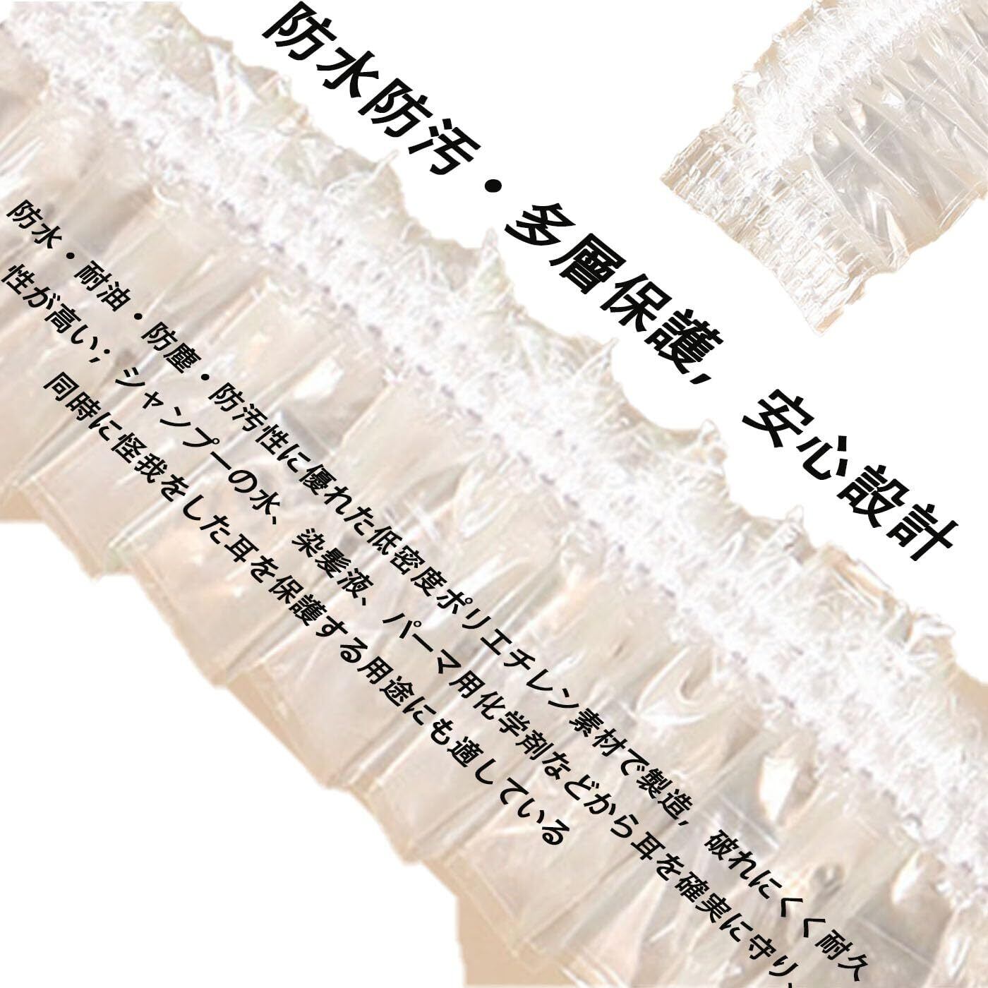 防水防汚・多層保護,安心設計:防水・耐油・防塵・防汚性に優れた低密度ポリエチレン素材で製造,破れにくく耐久性が高い;シャンプーの水、染髪液、パーマ用化学剤などから耳を確実に守り、同時に怪我をした耳を保護する用途にも適している