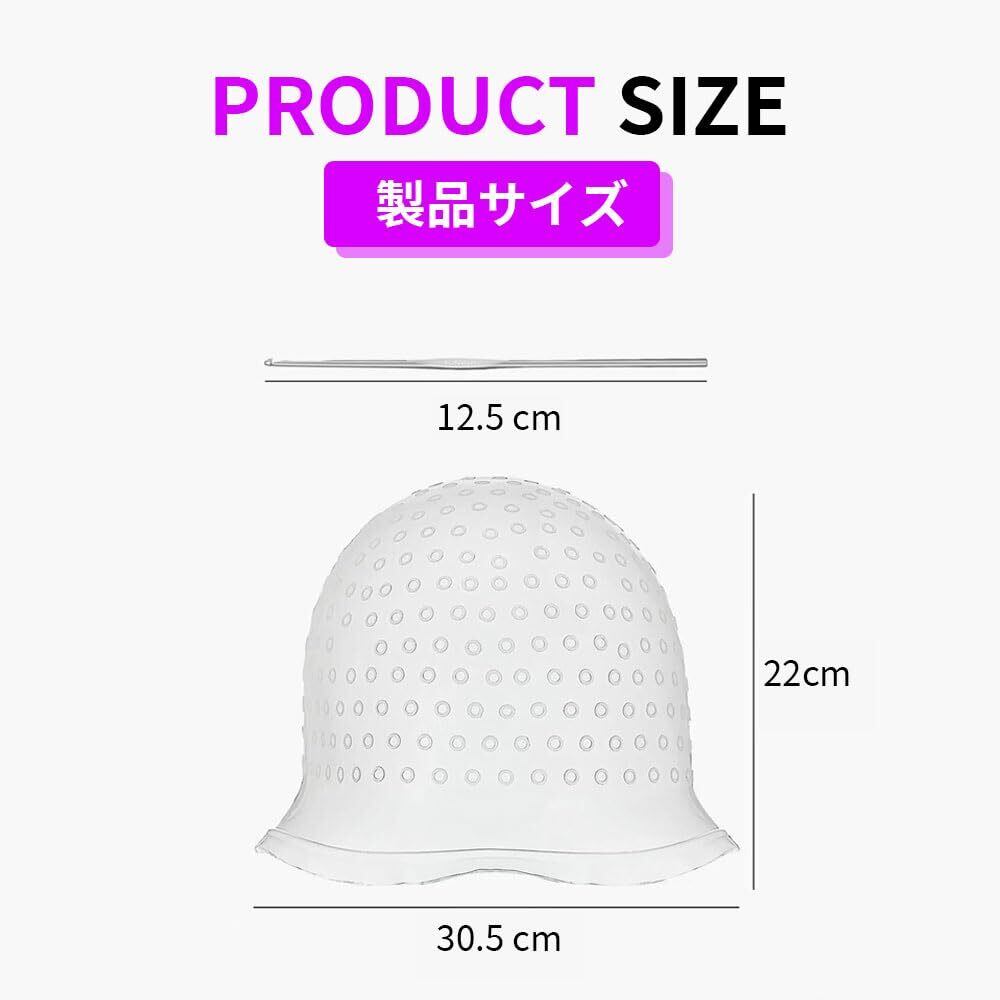 【セット内容&サイズ】 セット内容:シリコン製毛染めキャップ(約21×30cm)×1、かぎ針(約12.5cm)×1、染毛ブラシ(約21×4cm)×1。自宅で簡単にメッシュやハイライトができる便利な3点セットです。