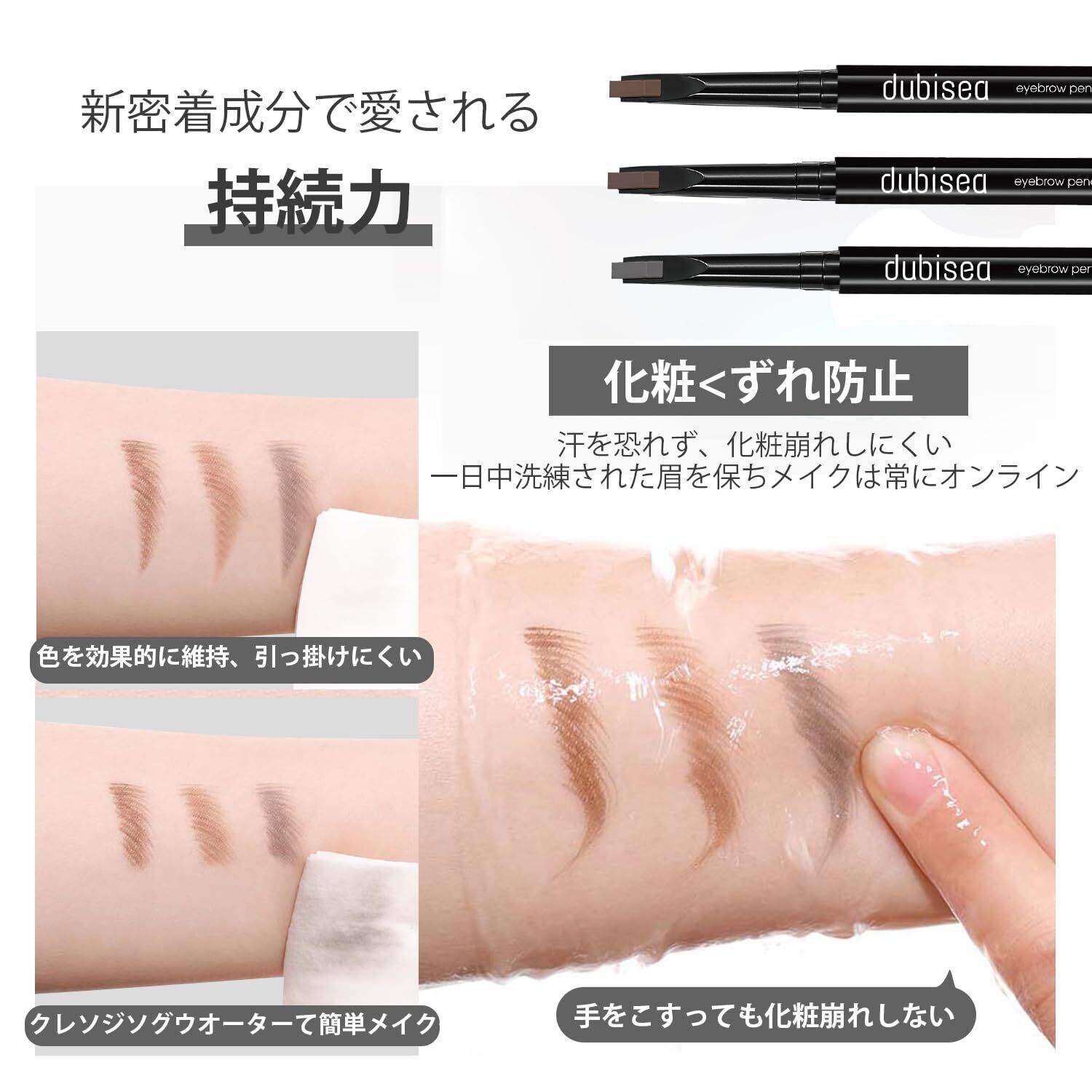 長持ちする防水・防汗:朝描いた眉毛が一日中崩れずにキープされます、雨の日や汗をかく場面でも眉毛が消える心配なし。 落ちにくく、美しい仕上がりが長続き、長時間メイクをキープしたい方に最適です!普段お使いのメイク落としで簡単に落とせます。 コンパクトサイズでポーチに入れて持ち運びにも便利。外出先でもさっと眉毛を整えられます。
