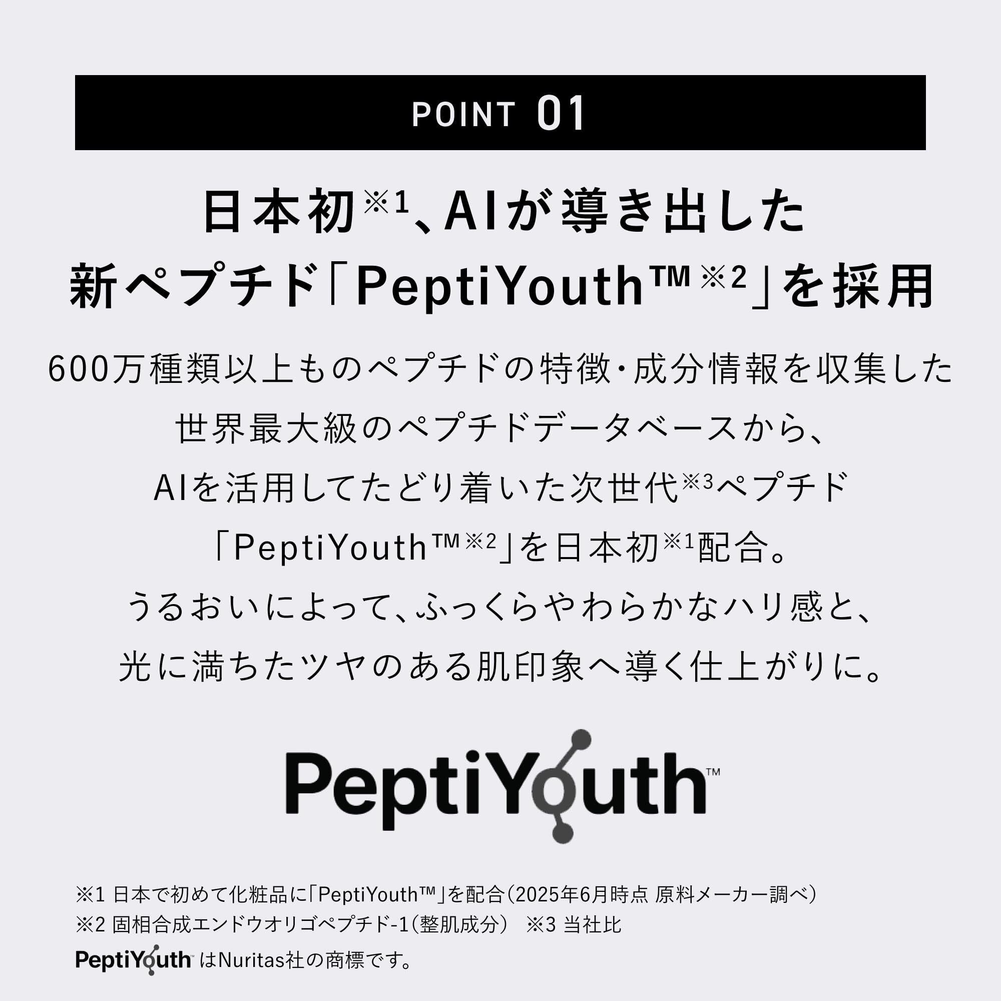 【商品について】◆日本初、AIが導き出した新ペプチドPeptiYouthを採用◆レフ板発想の毛穴レスなツヤ美肌へ◆保湿力は119%に!自然由来指数92%の美容液プライマー◆敏感肌パッチテスト、ノンコメド試験済み。肌にやさしい石けんオフ