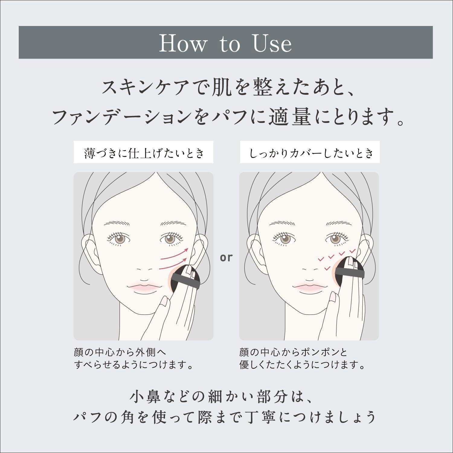 別売りの専用ケースにセットしてお使いください。初めてお使いになる場合は、マイクロメッシュから中身が出るまでパフで5回ほど押してください。スキンケアなどで肌をととのえたあと、パフに適量をとり、肌にのばします。パフをすべらせるようにのばすとナチュラルな仕上がりに、肌をポンポンとたたくようにのばすとカバー力のある仕上がりになります。他の紫外線防止効果のある化粧品と併用するとより効果的です。別売りのパフ (エスプリーク エマルジョン コンパクト用 パフ) もあります。