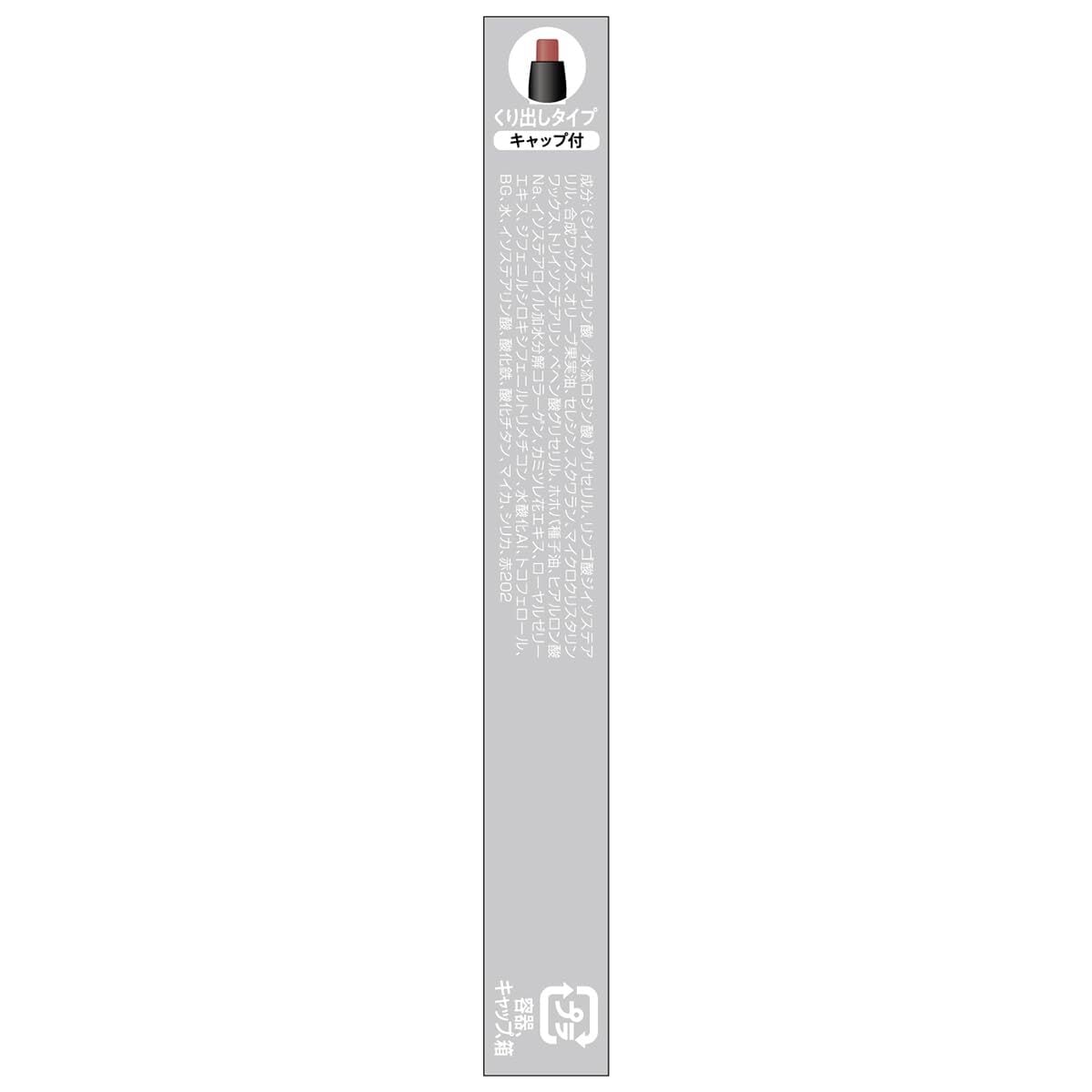[単剤](ジイソステアリン酸/水添ロジン酸)グリセリル、リンゴ酸ジイソステアリル、合成ワックス、オリーブ果実油、セレシン、スクワラン、マイクロクリスタリンワックス、トリイソステアリン、ベヘン酸グリセリル、ホホバ種子油、ヒアルロン酸Na、イソステアロイル加水分解コラーゲン、カミツレ花エキス、ローヤルゼリーエキス、ジフェニルシロキシフェニルトリメチコン、水酸化Al、トコフェロール、BG、水、イソステアリン酸、酸化鉄、酸化チタン、マイカ、シリカ、赤202
