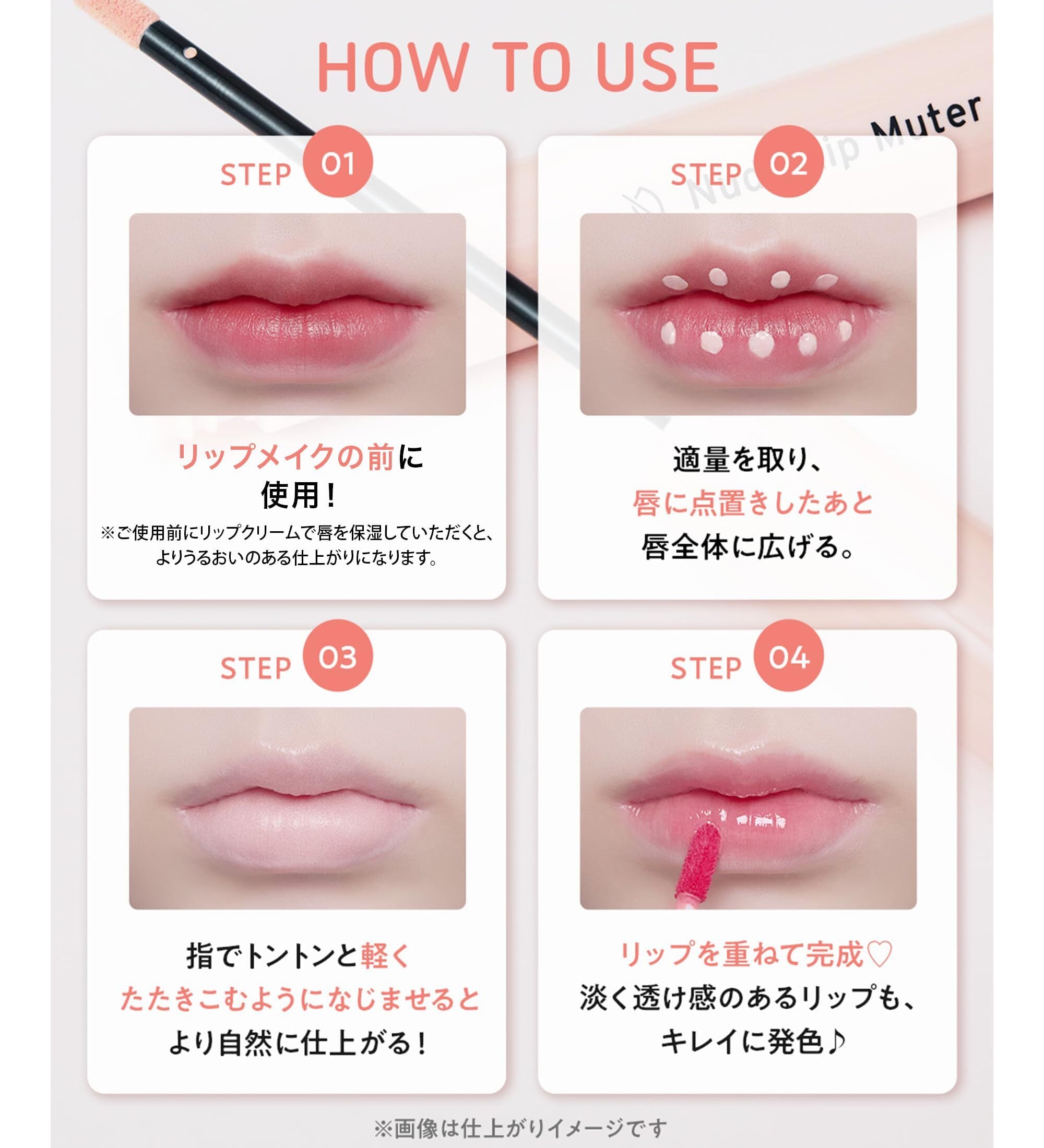 【使用方法について】◆リップメイクの前に使用します。※ご使用の前にリップクリームで唇を保湿していただくと、よりうるおいのある仕上がりになります。◆適量をとり、くちびるに点置きしたあと唇全体に広げます。◆指でトントンと軽くたたきこむようになじませるとより自然に仕上がります。◆リップを重ねて完成です。