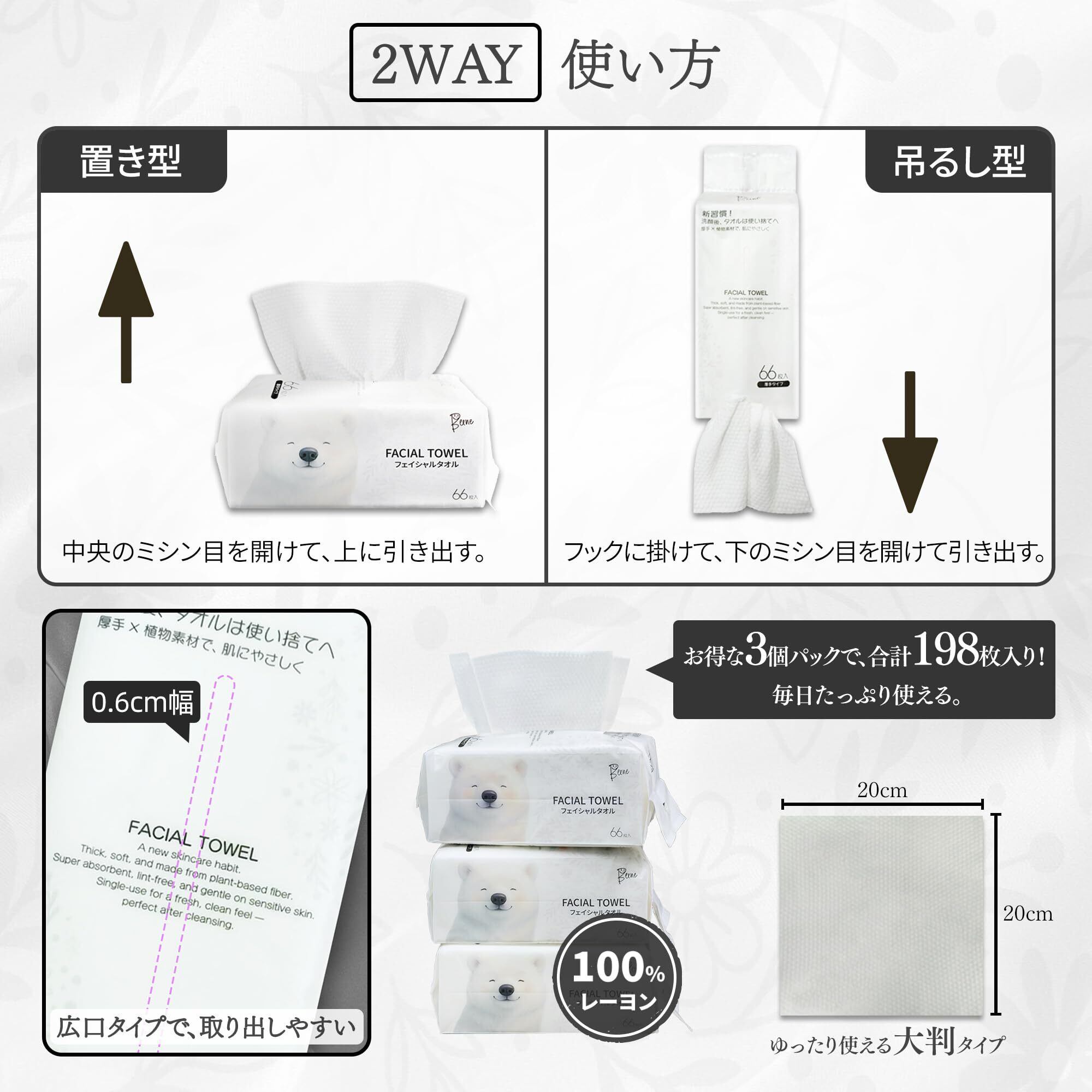 フェイシャルタオル 厚手 66枚入り 大容量 植物素材 無蛍光無香料 乾湿両用 大判速乾 毛羽立ちにくい 使い捨てタオル 洗顔・赤ちゃんケア・メイク落とし・キッチン掃除まで衛生的に使える 敏感肌・肌荒れ対策に最適 旅行や出張にも便利 (3パック(66枚入×3))