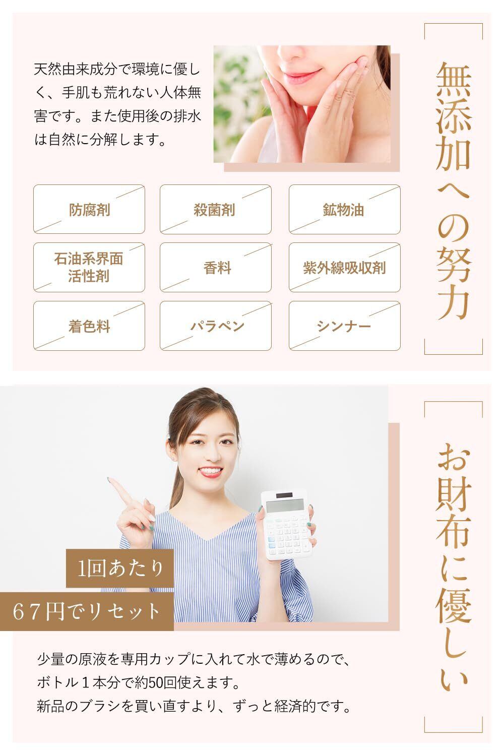 【仕上がりが違う!汚れを落とすだけでなく、使用後の化粧ノリが違う】洗浄液なので、汚れを落とすのは当たり前です。クレンジングや他社さまの洗浄液との違いは、洗い上がりにあります。除菌効果が高く、抗菌加工でカビが発生しにくく、さらにメイクブラシの購入時のようなふわっふわっな肌触りで化粧ノリも良くなります。
