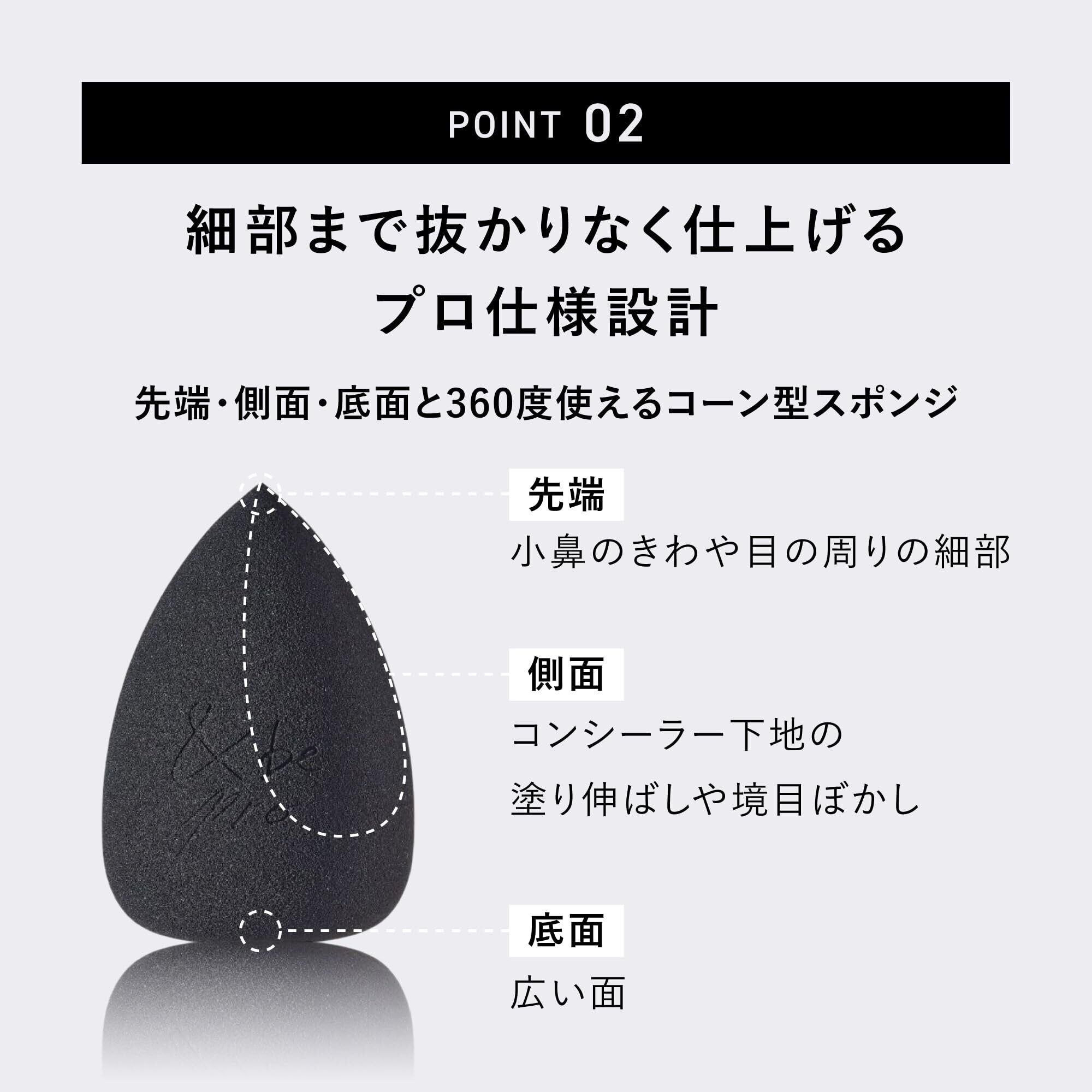 POINT2―細部まで抜かりなく仕上げるプロ仕様設計 先端・側面・底面と 360 度使える!コンシーラーなどの塗り伸ばしや境目ぼかしには側面、広い面に塗る際は 底面、小鼻のキワや目周りの細部は先端を使うことで、細部までもれなく仕上げることができる便利なコーン 型のスポンジ。 余分な力をかけずに握って動かせるサイズ形状なので、ファンデーションや下地の付けすぎを 防ぎ、誰でも簡単にプロ級の仕上がりをお楽しみいただけます。