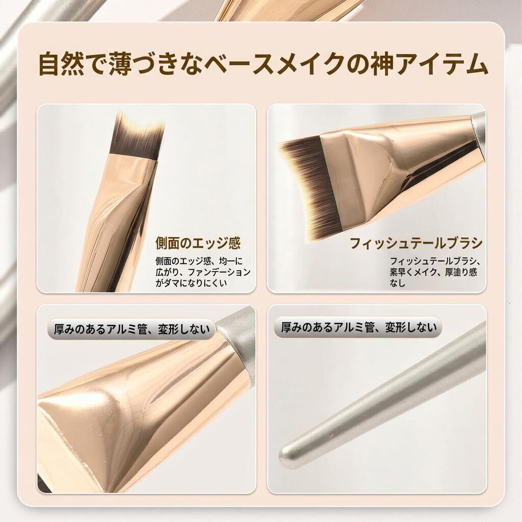 【均一に塗る・美肌作り】 このファンデーションブラシは、リキッドファンデーションやクリームファンデーションを均一に塗布し、ムラなく美しいベースメイクを作り上げます。細かい毛先で肌に優しく密着し、滑らかな仕上がりを実現します。
