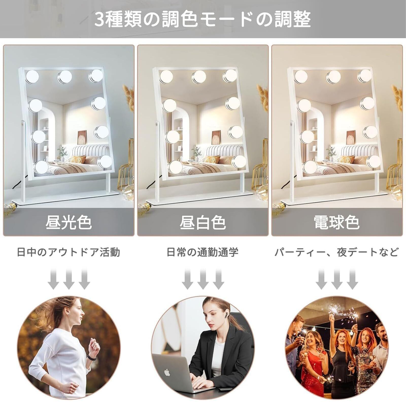 FENCHILIN 女優ミラー 卓上鏡 ハリウッドミラー 9個LED電球付き 10倍拡大鏡付き 三色照明モード 明るさ調節可能 360度回転 給電式(ホワイト)