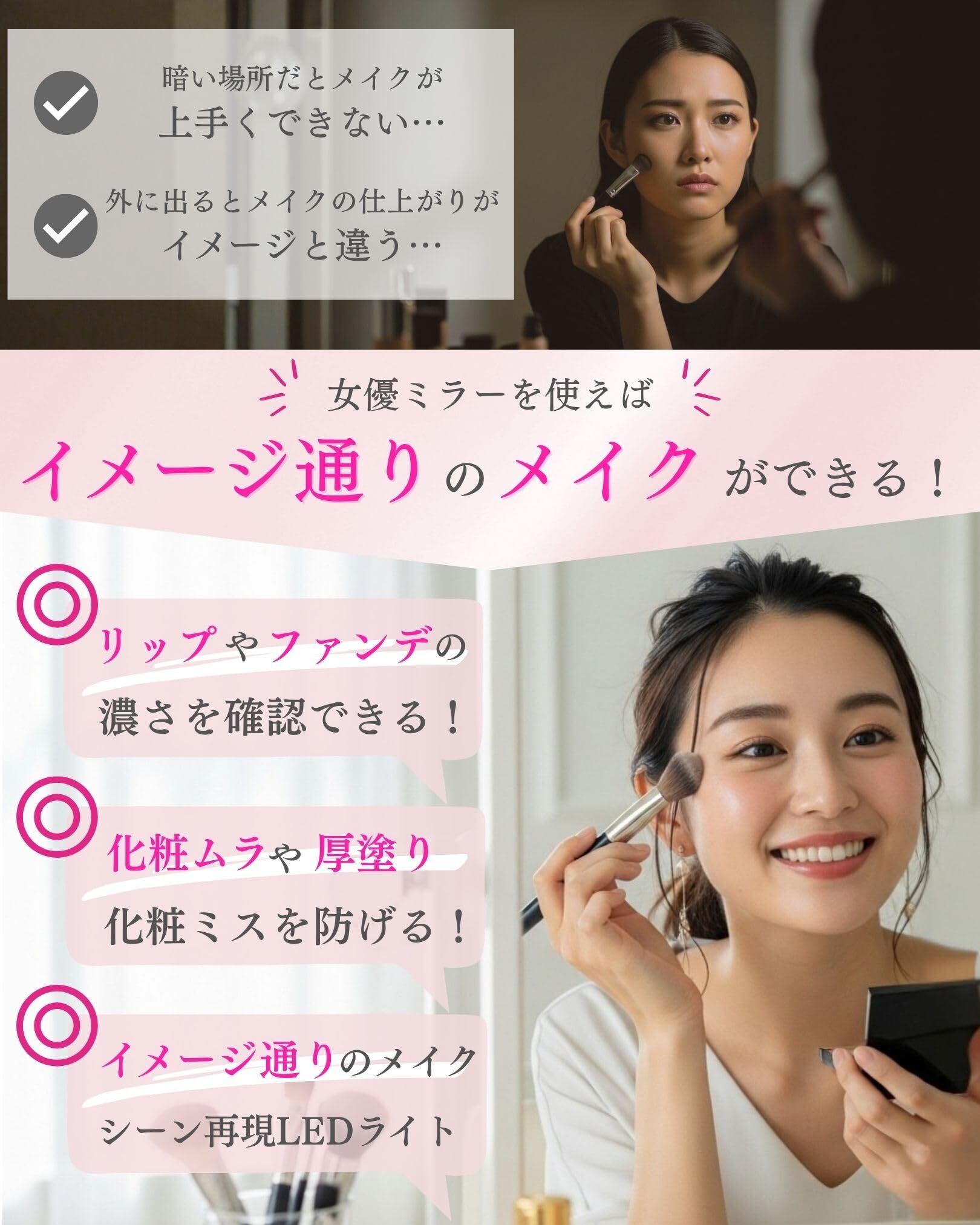 【こんなメイクのお困り事はありませんか?】「暗い場所だとメイクが上手くできない…」「外に出るとメイクの仕上がりがイメージと違う…」そんなお困りごとを解決するアイテムに女優ミラーがオススメです