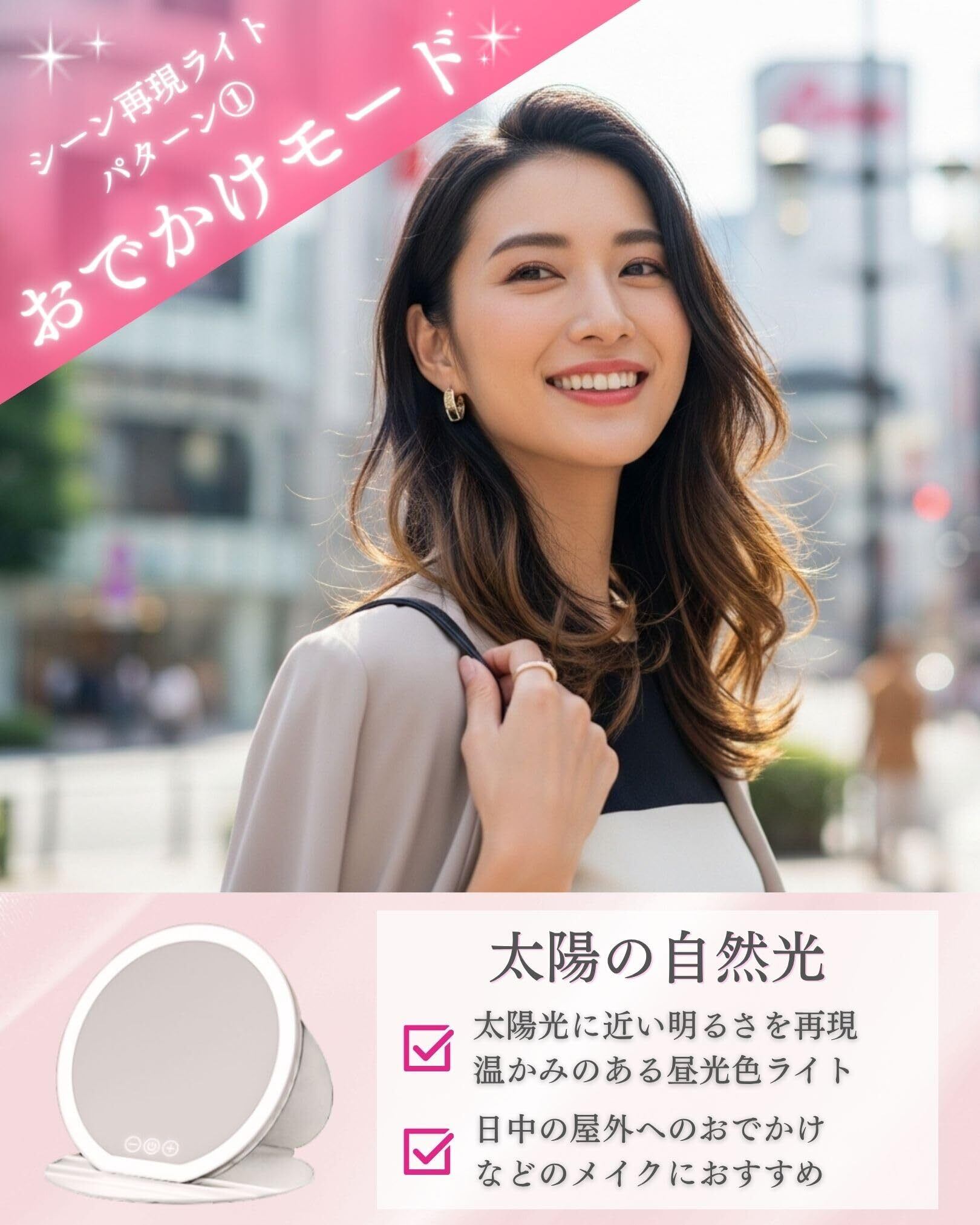 【おでかけモード(太陽光)】太陽光に近い明るさ再現した温かみのある昼光色です。日中の屋外へのおでかけ などのメイクにおすすめです。