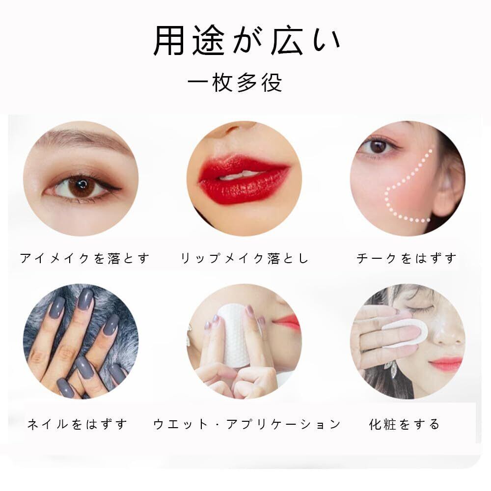 【一枚多用途】拭き取りパッドが色々な場合に活用しています。メーク落としシート、コットン拭き取り用、化粧水用コットン、ネールオフ用コットンなどとして利用できます。メイクを落としたり製品を塗布したりするための最も 的な方法です。トナーやローションを効率的かつ均一に塗布するの 。