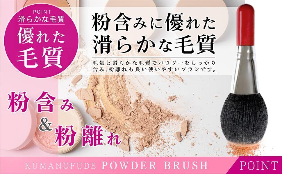 天然馬毛100%を使用。やわらかくしなやかな毛質は肌あたりがやさしく、発色も抜群です。しっかりとしたコシがありながらも、なめらかな肌触りで敏感肌の方にもおすすめ。ナチュラルメイクからしっかりメイクまで、幅広い仕上がりに対応します。