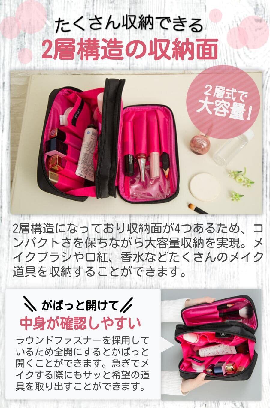 【2層構造の収納面】2層構造になっており収納面が4つあるため、コンパクトさを保ちながら大容量収納を実現。メイクブラシや口紅、香水などたくさんのメイク道具を収納することができます。